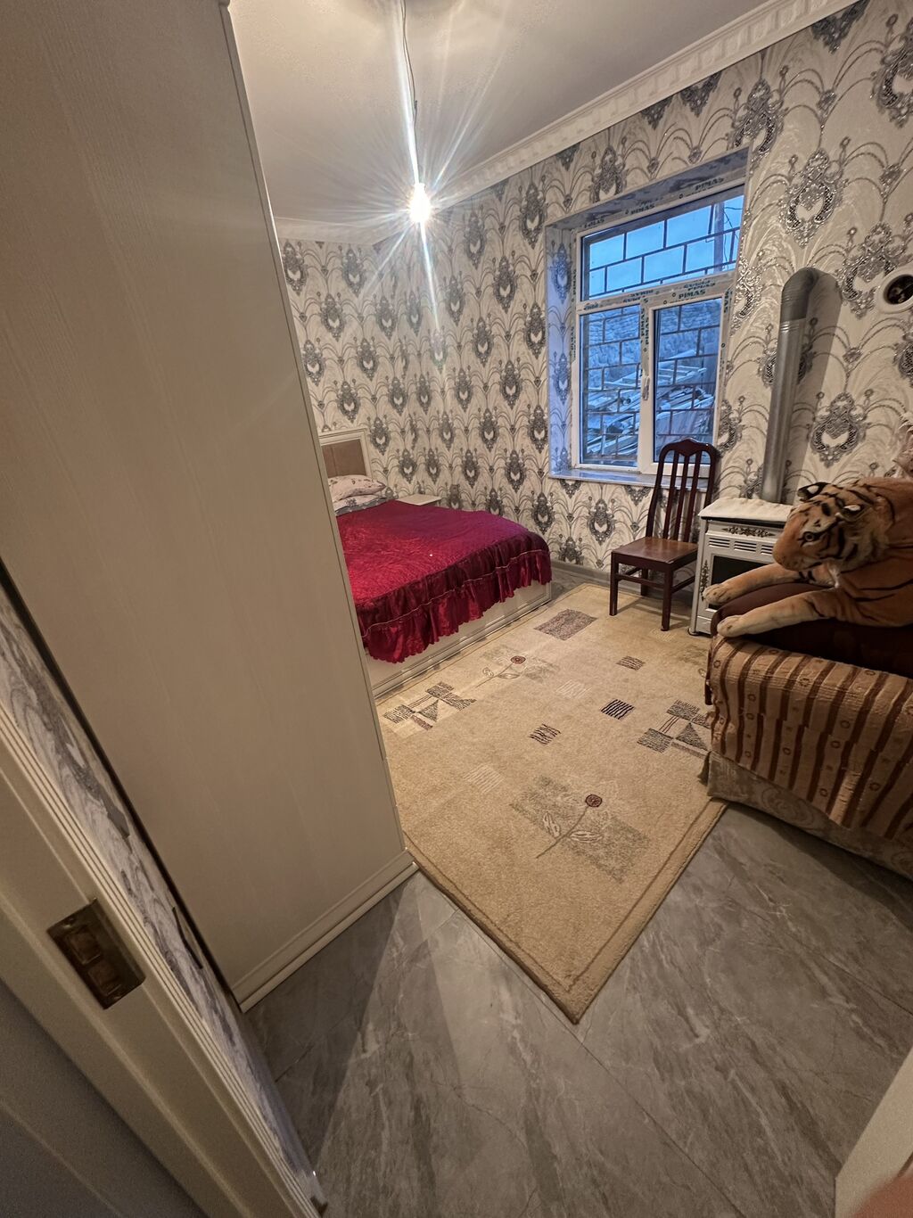 - Otaqlar: Divarlarda dekorativ oboy, tavan qəlibləri, asma işıqlandırma. Döşəmələrdə kafel və laminat kombinasiyası. Otaqda pəncərə barmaqlığı ilə.