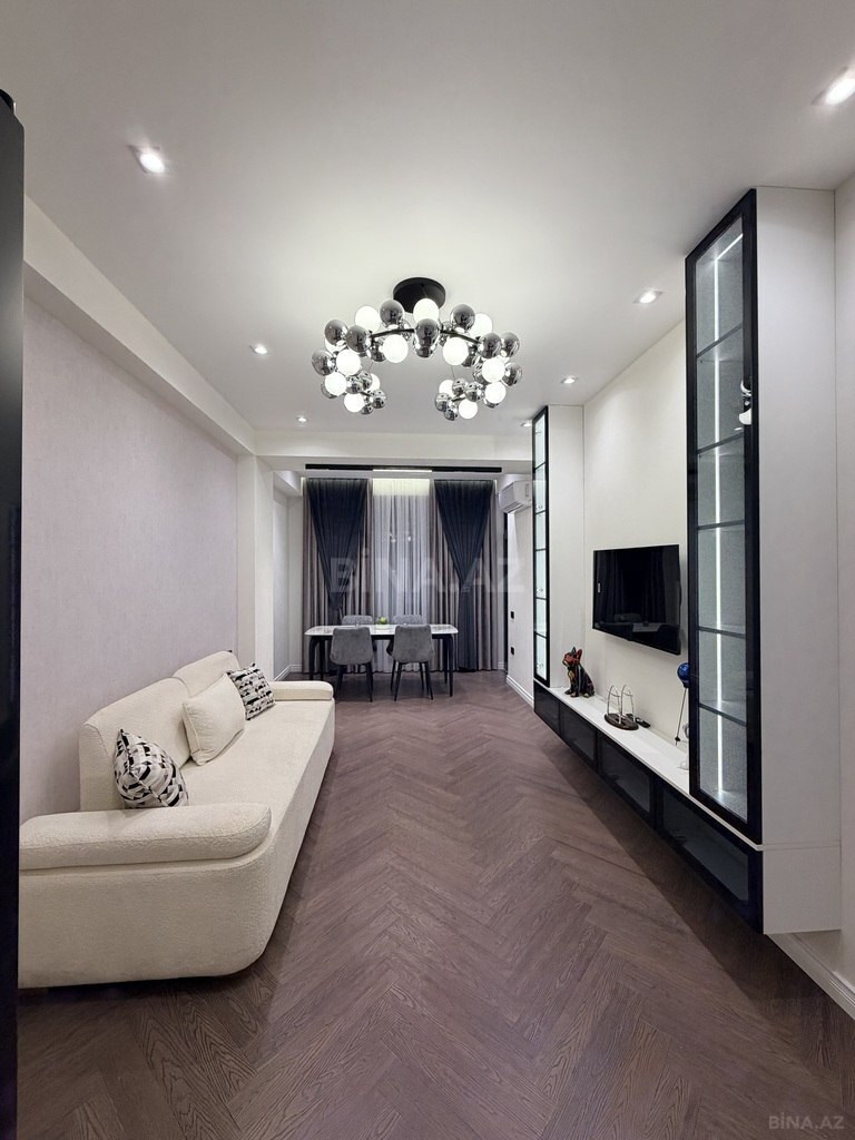 Mənzilin hər detalı zövqlə və keyfiyyətli materiallardan istifadə edilərək dizayn olunub. Geniş və işıqlı otaqlar, müasir mətbəx mebeli, yüksək səviyyəli santexnika və zərif işıqlandırma sistemi ilə seçilir.