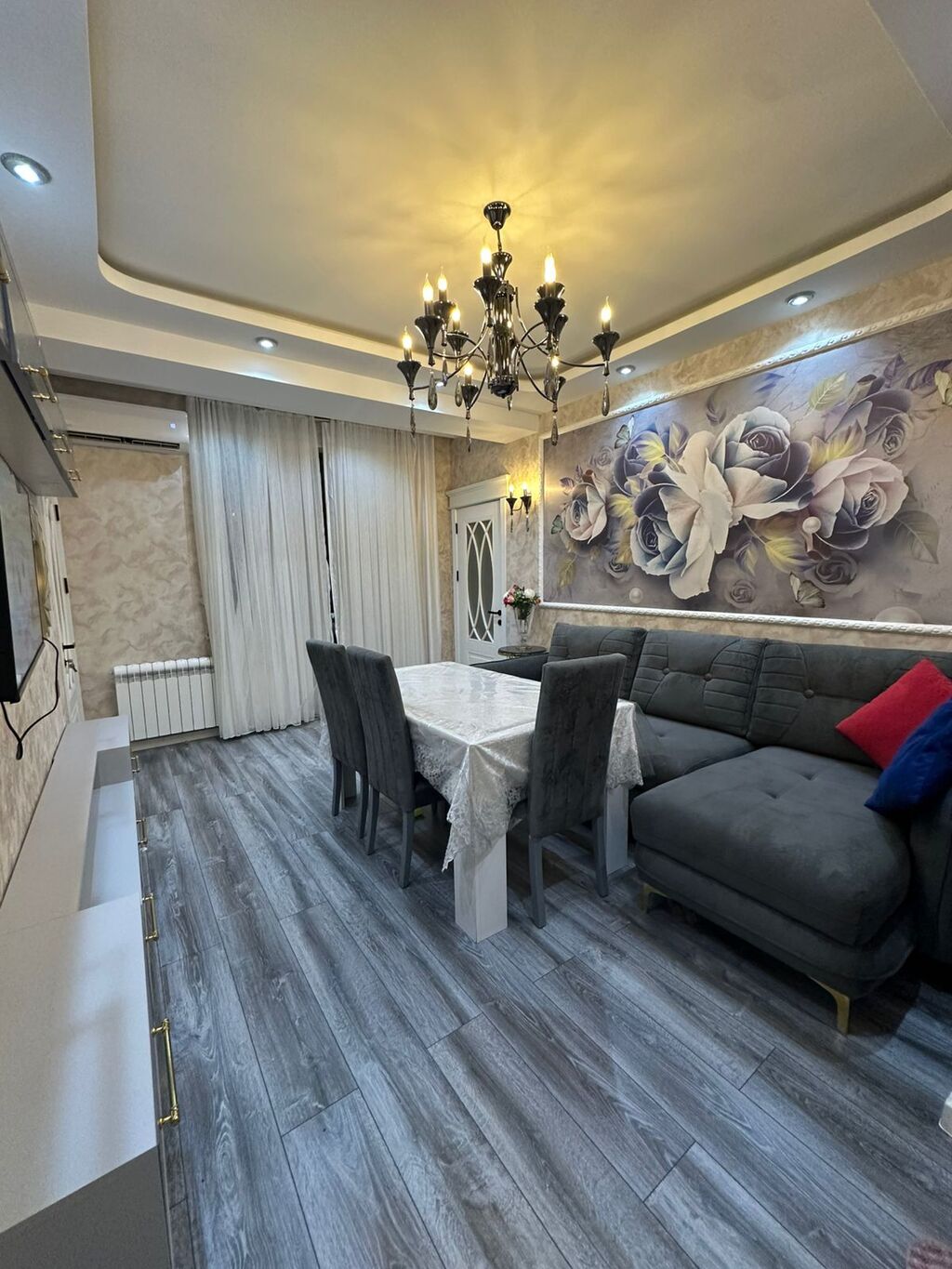 - Zövqlü layihələndirilmiş qonaq otağı: dekorativ gips tavan, LED-spot işıqlar, klassik şamdan tipli çilçıraq, iri dekorativ güllü divar paneli. Yumşaq L-formalı divan, 4 nəfərlik yemək masası və 4 stul. Divar tipli TV və uzun media-konsol (üst dolab modulları ilə).