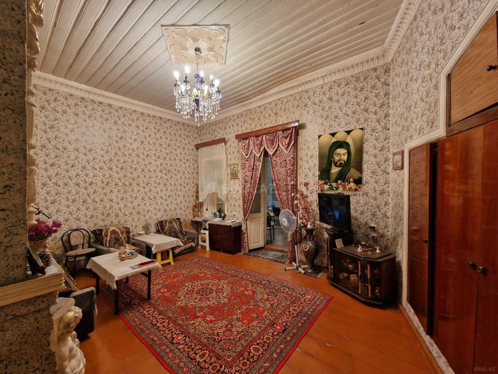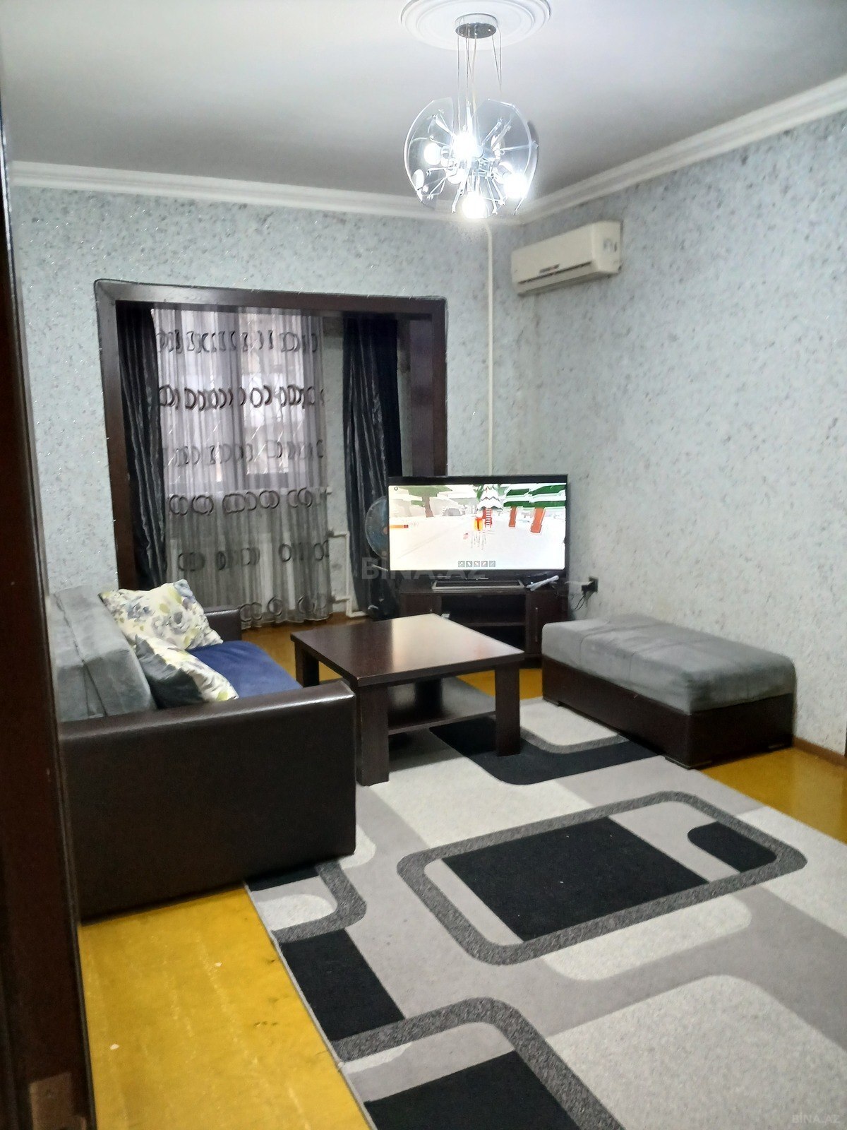 - Geniş zal: divan, stol-stul dəsti, TV, divar dolabı, pərdə-karniz, çilçıraq; split-kondisioner.