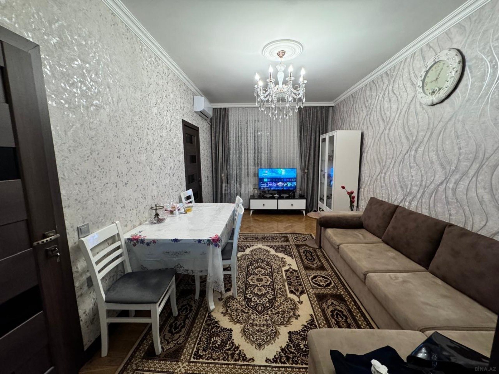 Mənzilin təmirində bahalı materiallardan istifadə olunub. Pol mozaika parketdir.