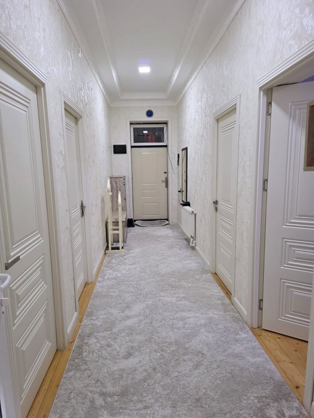 - Dəhliz: dekorativ suvaqlı açıq rəng divarlar, yuxarı LED işıqlandırma, tavan karnizi, radiatorla mərkəzi istilik, güzgü və divar konsolu üçün yer, həm giriş, həm də arxa çıxış qapısına keçid.