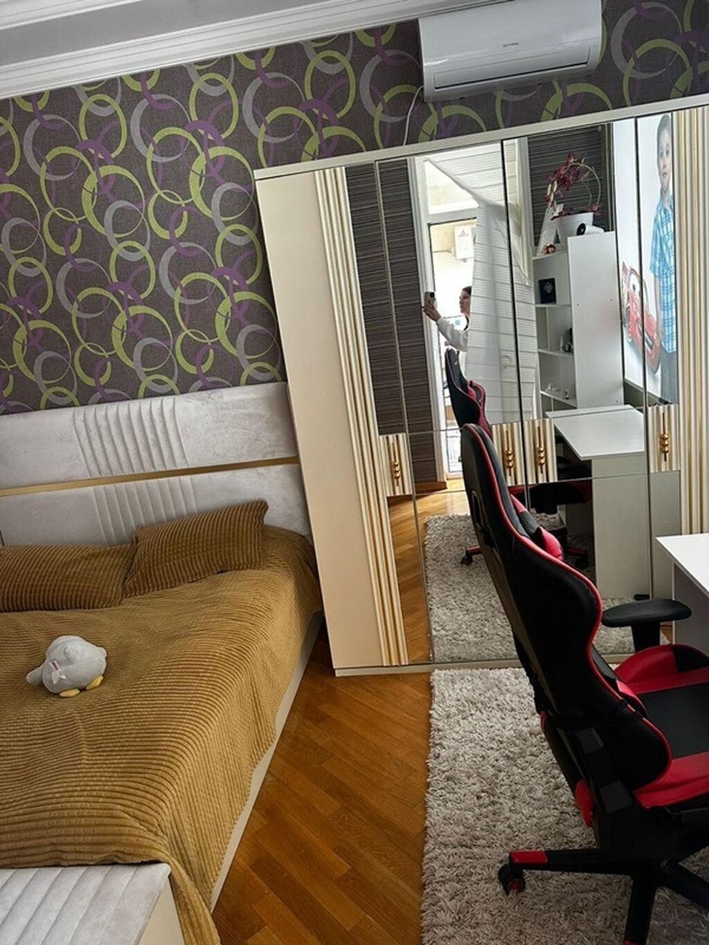 - Uşaq/gənc otağı: birnəfərlik çarpayı, yastıq və örtü, sürüşən güzgülü qarderob, iş masasının yanında ergonomik oyun/kreslo oturacağı, açıq rəfli modul, xalça. Otaqda kondisioner var.