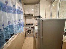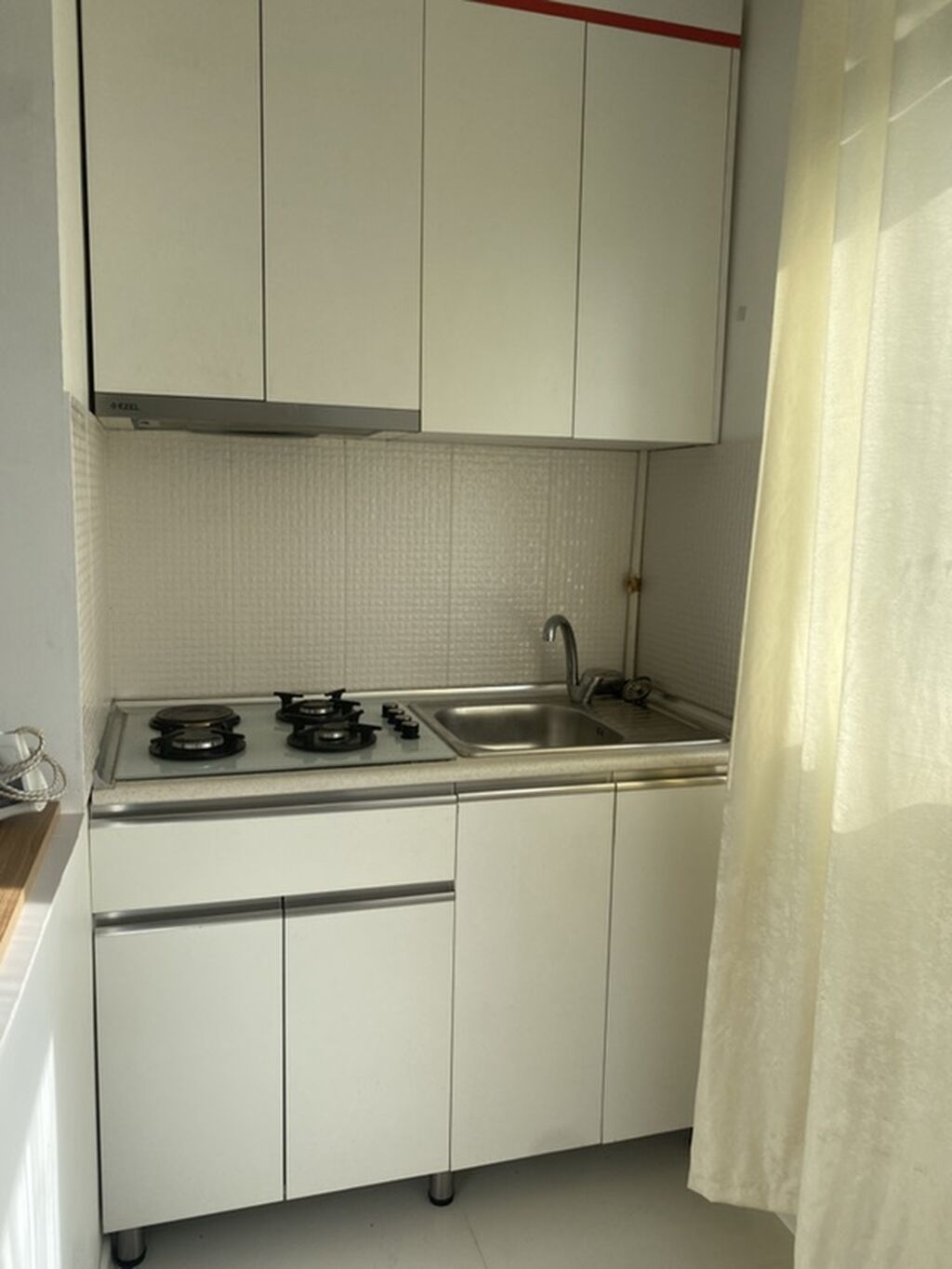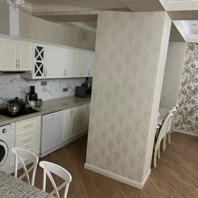 Kirayə verilir – səliqəli, işıqlı 1 otaqlı mənzil (studyo planlı). - Açıq mətbəx: üst və alt dolablar, qaz plitəsi (2 gözlü), aspirator, paslanmayan polad lavabo, pəncərə yaxınında işıqlı zona. - Otaq: ağ laminat döşəmə, pəncərəli genişlik, çilçıraq işıqlandırma, divan, dekorativ yastıqlar. - Yemək zonası: 4 ədəd güllü kreslo və ağ masa, ayrıca bufet/dolab. - Soyuducu mövcuddur. - Yataq otağı: taxta çarpayı karkası və pəncərə; pərdələr asılıb. - Neytral rənglərdə təmir, günəş işığı alan pəncərələr, yüngül pərdələr. Mənzil tam yaşayış üçün əsas mebel və məişət avadanlıqları ilə təchiz olunub; rahat planlama və sakit atmosfer.