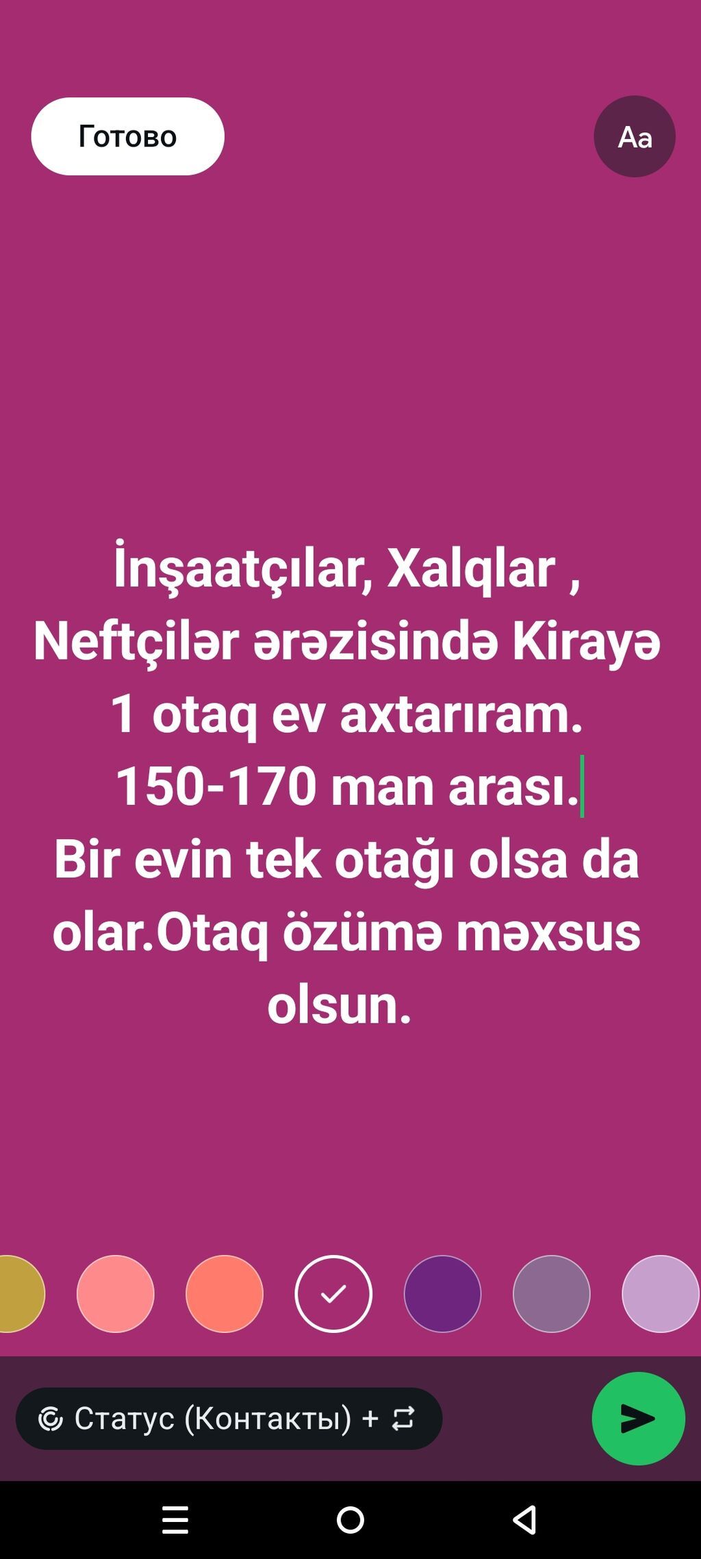 Kirayə üçün 1 otaqlı ev/otaq axtarılır. Məkan: İnşaatçılar, Xalqlar, Neftçilər ərazisi. Büdcə: 150–170 manat arası. Tələblər: - Tam 1 otaqlı ev və ya mövcud mənzilin tək otağı da uyğun ola bilər - Otaq yalnız mənə məxsus olsun (şəxsi otaq)