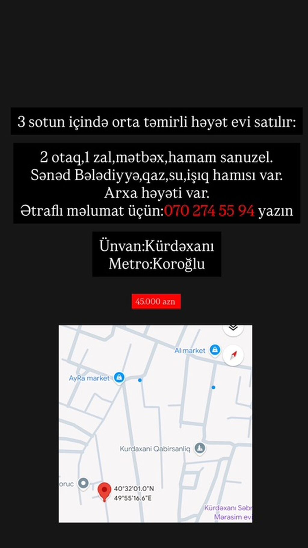 Mərdəkan gəsəbəsi MERLİN və İBO marketdən 300 metr məsafədə 4.2 sotda yeni inşa edilmiş bag evi satılır, 180 kv.m, 1 zal, 3 yataq, dolab otağı, 2 s/q, əla təmirlidir, isti döşəmə, kombi istilik sistemi, söhbətqah, filterli hovuz, su ambarı 7 ton, manqal, qaz, su və işıq daimidir. Çıxarışı var. Bag yaşayış massivində yerləşir və il boyunca yaşamaq üçün yararlıdır. Yolu asvalt örtüklüdür.
