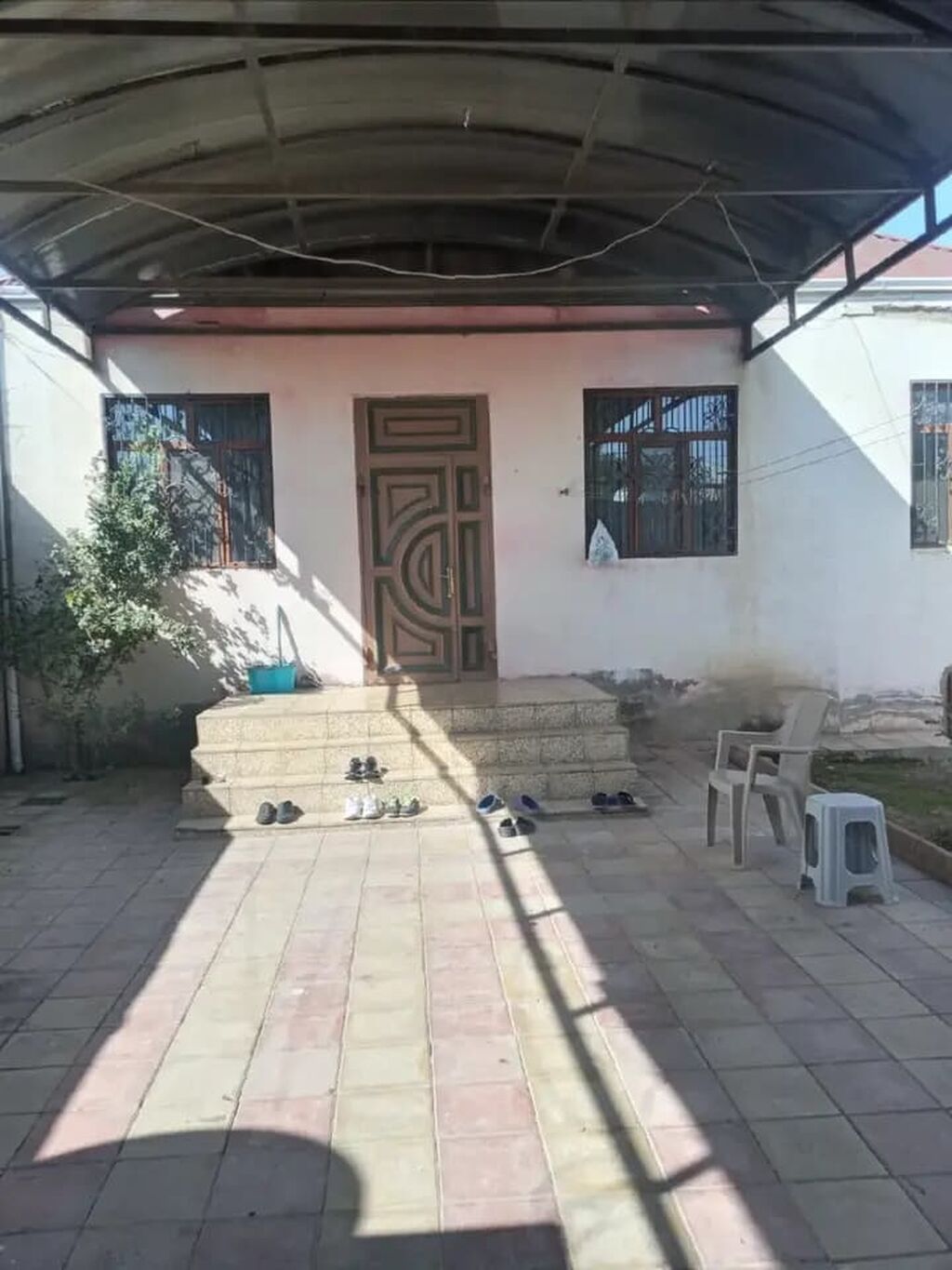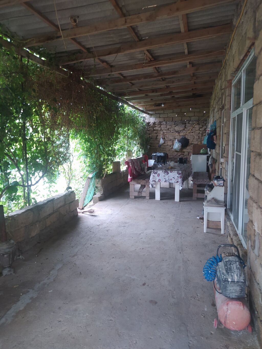 Bağ evi və həyətyanı sahə - Geniş, üstüörtülü eyvan/veranda: taxta konstruksiyalı, üzüm sarmaşığı ilə kölgələnmiş, masa-stul üçün yer, rahat istirahət zonası. - Daş divarlı ev korpusu, plastik pəncərə və qapılar görünür. - Böyük həyətyanı sahə: günəbaxan, üzüm tənəkləri, meyvə-kol bitkiləri və dekorativ yaşıllıq. - Ayrı təsərrüfat/köməkçi tikililər üçün sahə; həyətin müxtəlif hissələrində tikinti materialları və saxlanma zonaları. - Açıq həyət meydançası: avtomobil girişi və ya istirahət üçün uyğundur. - Su üçün böyük plastik çən (üst qapaqlı) və suvarma üçün şlanq xətləri. - Həyətdə velosiped saxlama yeri, kiçik təsərrüfat heyvanları üçün uyğun mühit. - Üzüm çardağı ilə kölgəli giriş və da ...