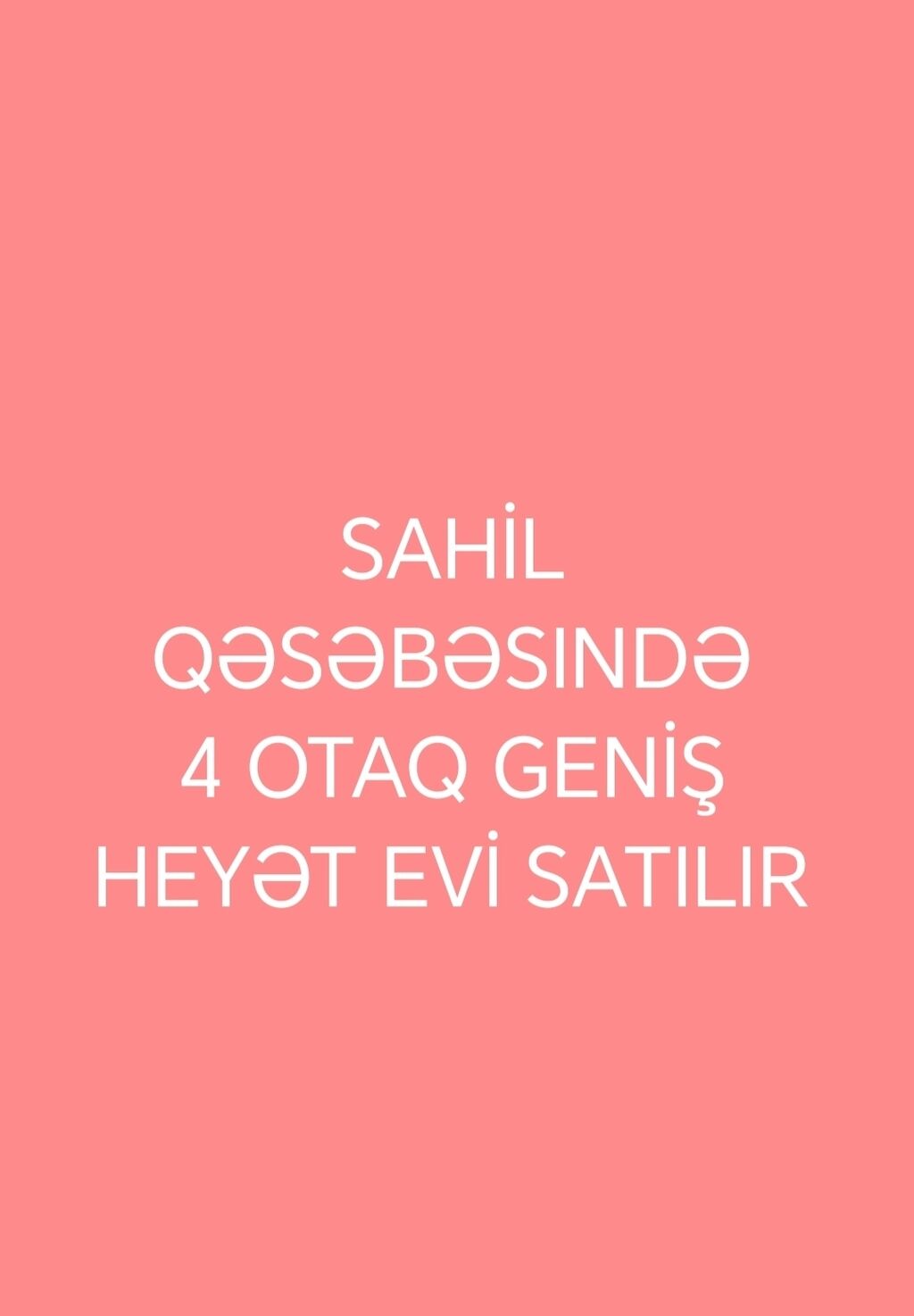 Sahil qəsəbəsində 4 otaqlı, geniş həyət evi satılır. Xüsusiyyətlər: - 4 ayrı otaq planı - Geniş həyət sahəsi - Müstəqil həyət evi formatı - Sakit, yaşayış üçün uyğun məkan — Sahil qəsəbəsi Yaşayış üçün rahatlıq və şəxsi həyət istəyənlər üçün uyğundur.