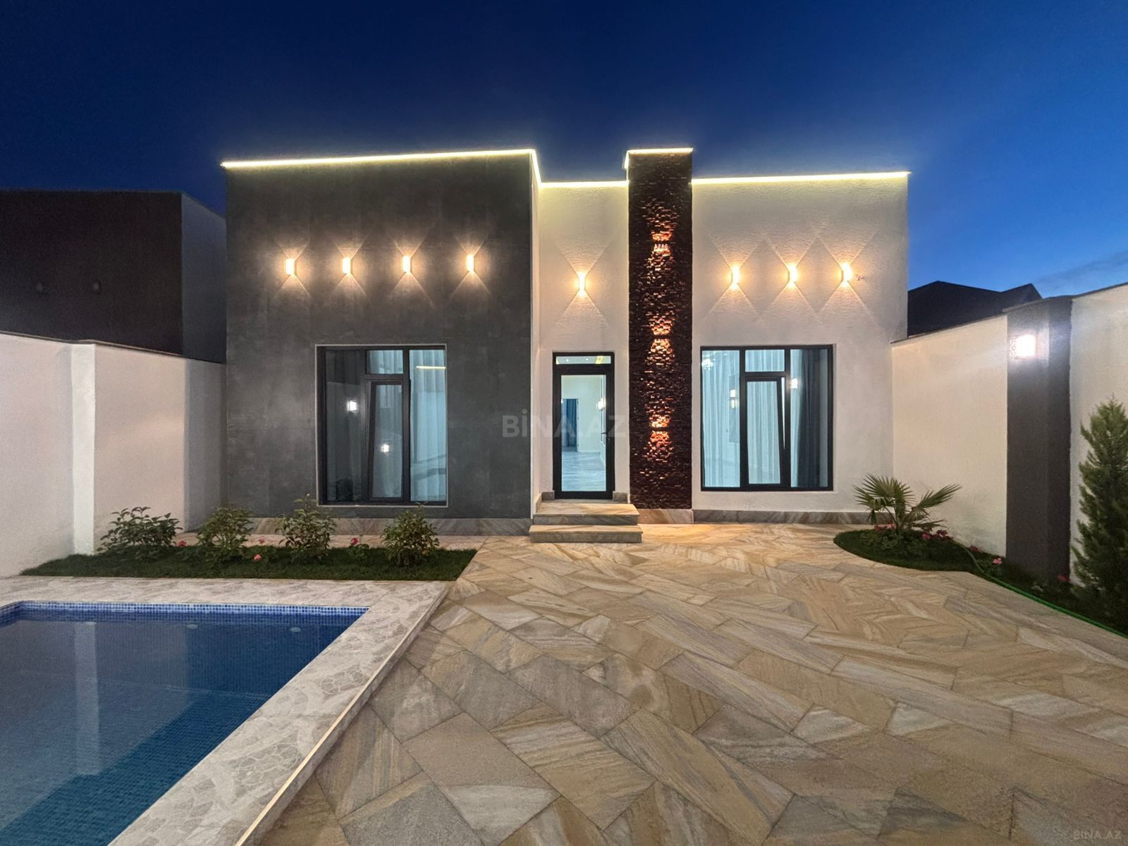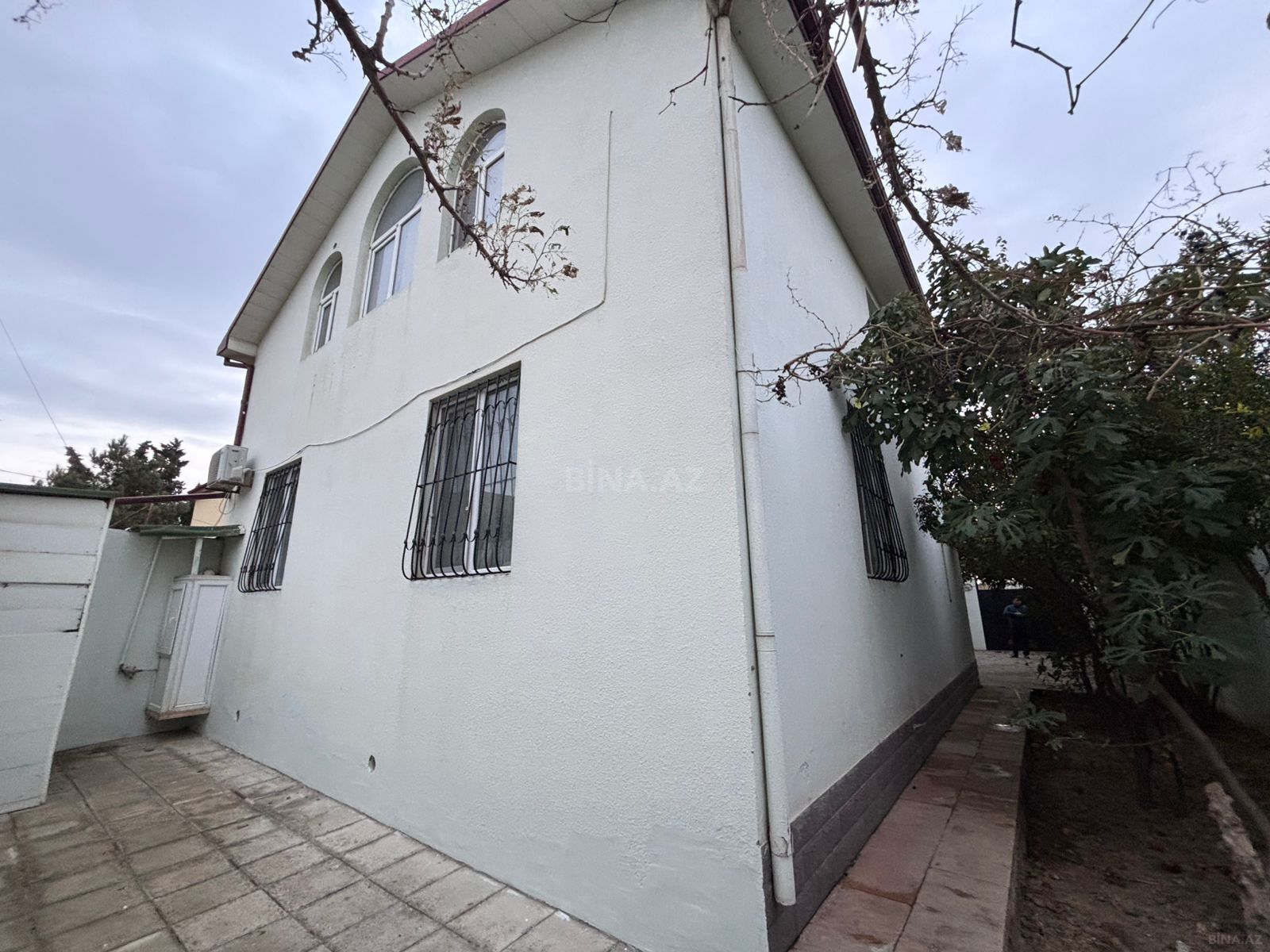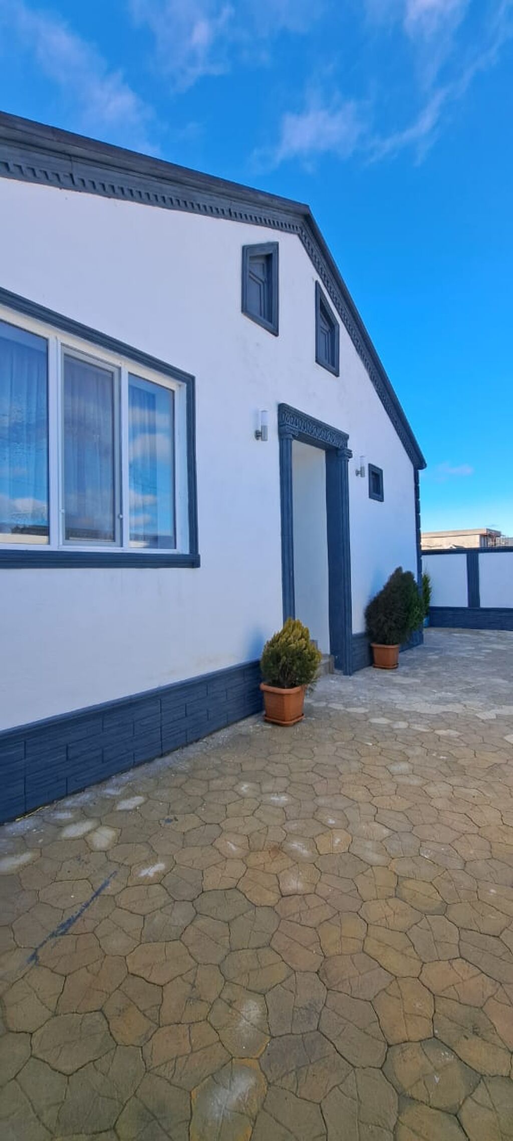 Satılır: həyət evi - Tip: Bir mərtəbəli həyət evi - Eksteryer: Ağ fasad, tünd boz dekor xəttləri və pilastrlarla vurğulanmış giriş portalı - Pəncərələr: Plastik (PVC) ikiqat şüşəli, dekorativ çərçivə ilə - Həyət: Tamamilə dekorativ daş/brusçatka ilə döşənib, geniş döngə yolu - Qoşa işıqlandırma: Giriş hissəsində fasad lampaları - Yaşıllıq: Girişdə və həyət boyunca dibçəkdə bəzək kolları - Su axıdıcı sistemi: Damdan yağış sularının kənarlaşdırılması üçün yağış boruları - Hasar: Bütöv hündür daş/monolit hasar, dekorativ karnizli üst xətt - Giriş qapısı: Dekorativ elementli, örtülü portal altında - Pəncərə sayı: Ön və yan tərəflərdə bir neçə işıqlı pəncərə, mansard hissədə kiçik dekor pəncərəl ...