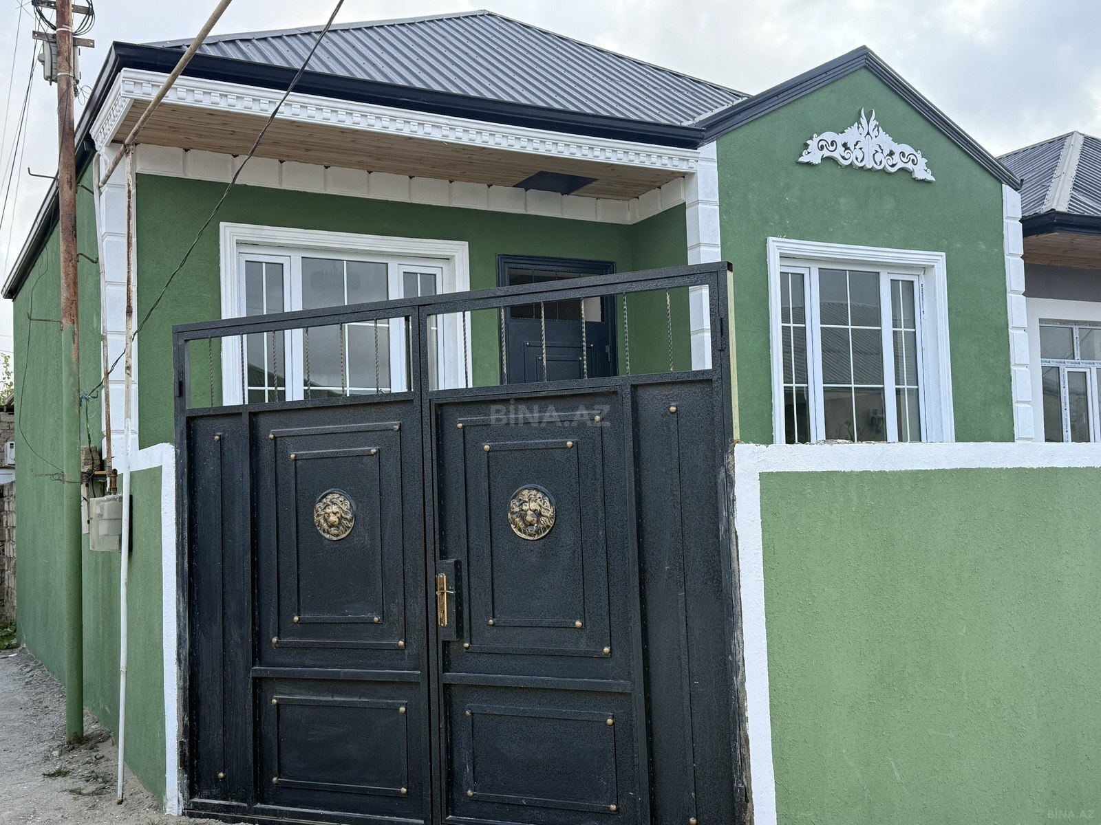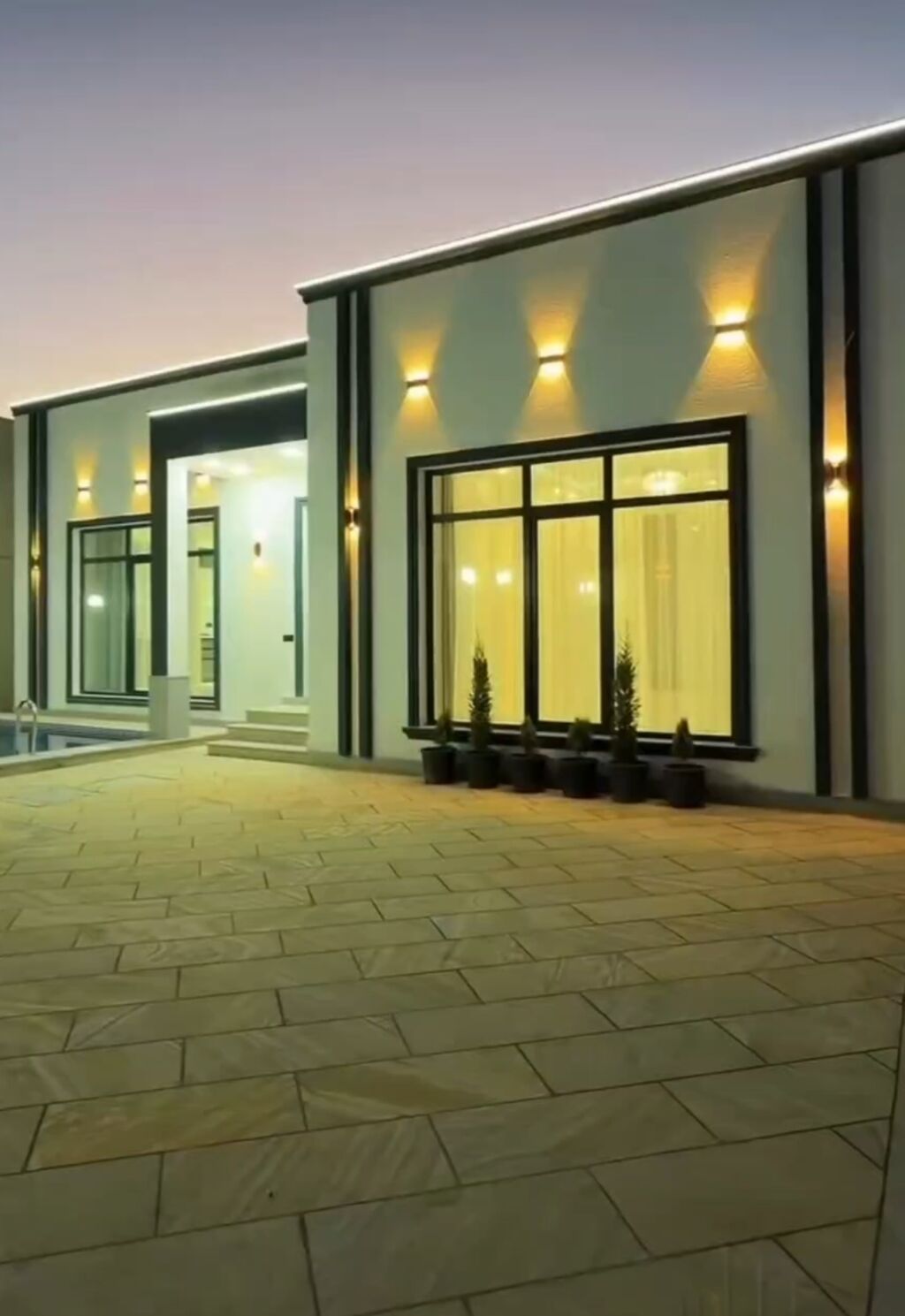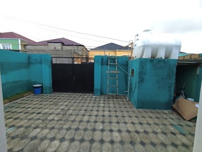 Şəhərdaxili həyətyanı ev - Torpaq sahəsi: dar keçidli, qapıya qədər daş döşəməli həyət. Geniş dəmir darvaza, üstü örtülü giriş hissəsi. - Həyət: dekorativ kollar, çiçək zolaqları üçün bordürlər, ayrıca kiçik torpaq sahəsi (bağ/çamən üçün uyğundur). - Ev: bir mərtəbə. Zal/oturma otağı: pəncərə, asma tavan işığı, kondisioner, divar televizoru üçün quraşdırma. Taxta döşəmə. - Kommunikasiya: elektrik sayğacı və kabel xətləri çəkilib. Su üçün həyətdə plastik çən (Şimşək LTD markalı) və filtr/boru sistemi görünür. Qaz üçün divar tipli qutu (xətlərin çıxışı) mövcuddur. - Veranda: evin girişində açıq eyvan. - Əlavələr: üstü bağlı maşınlıq kimi istifadə oluna bilən hissə, dar keçiddə su xətti və çən ...