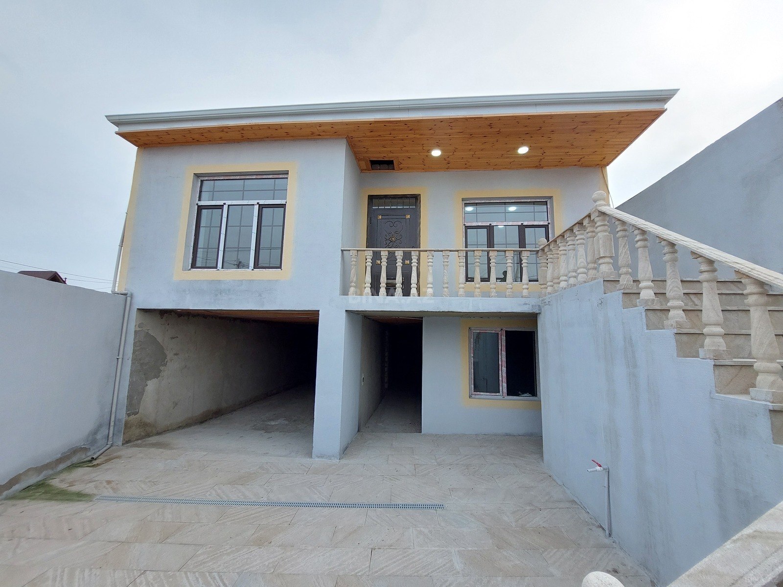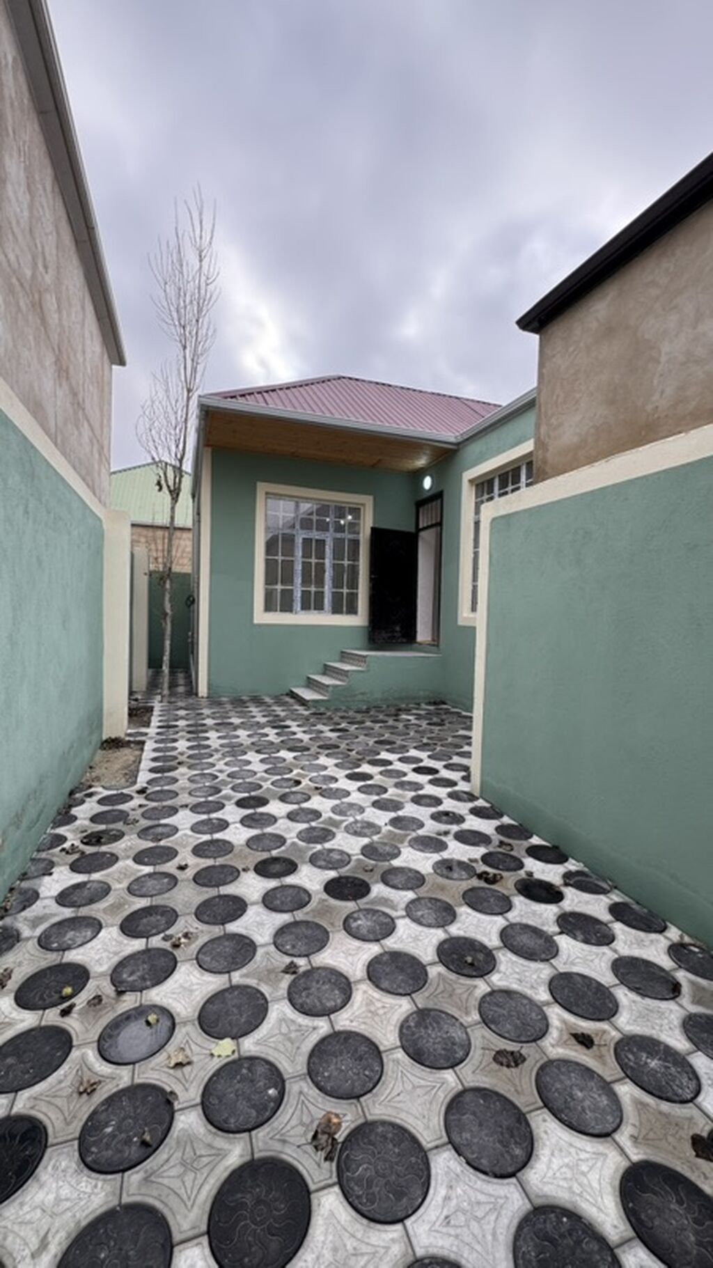Həyətyanı sahəsi və qapalı həyəti olan təkmərtəbəli fərdi yaşayış evi. - Planlaşma: giriş zalı/koridor, bir neçə otaq (şəkillərdə qapılar koridora açılır), mətbəx və sanitar qovşağı üçün ayrılmış zonalar. - Giriş: metal darvaza, maşın üçün həyətə giriş mümkündür. - Həyət: tam asfalt/daş döşəmə (naxışlı brük), addım pilləkəni olan eyvan. Həyətin hər iki tərəfi hündür hasarla əhatələnib. - Fasada: açıq yaşıl rəngli suvaq, dekorativ haşiyəli iri plastik pəncərələr, daxili zirzəmi/kommunikasiya lyuku üçün qapaqlı yer. - Dam örtüyü: metal/profilli material. - Tavan altı və eyvan: taxta üzləmə, girişdə işıqlandırma lampası. - Daxili: işıqlı koridor, ağ-krem tonlarda divarlar, tavan plintusu, LED ...