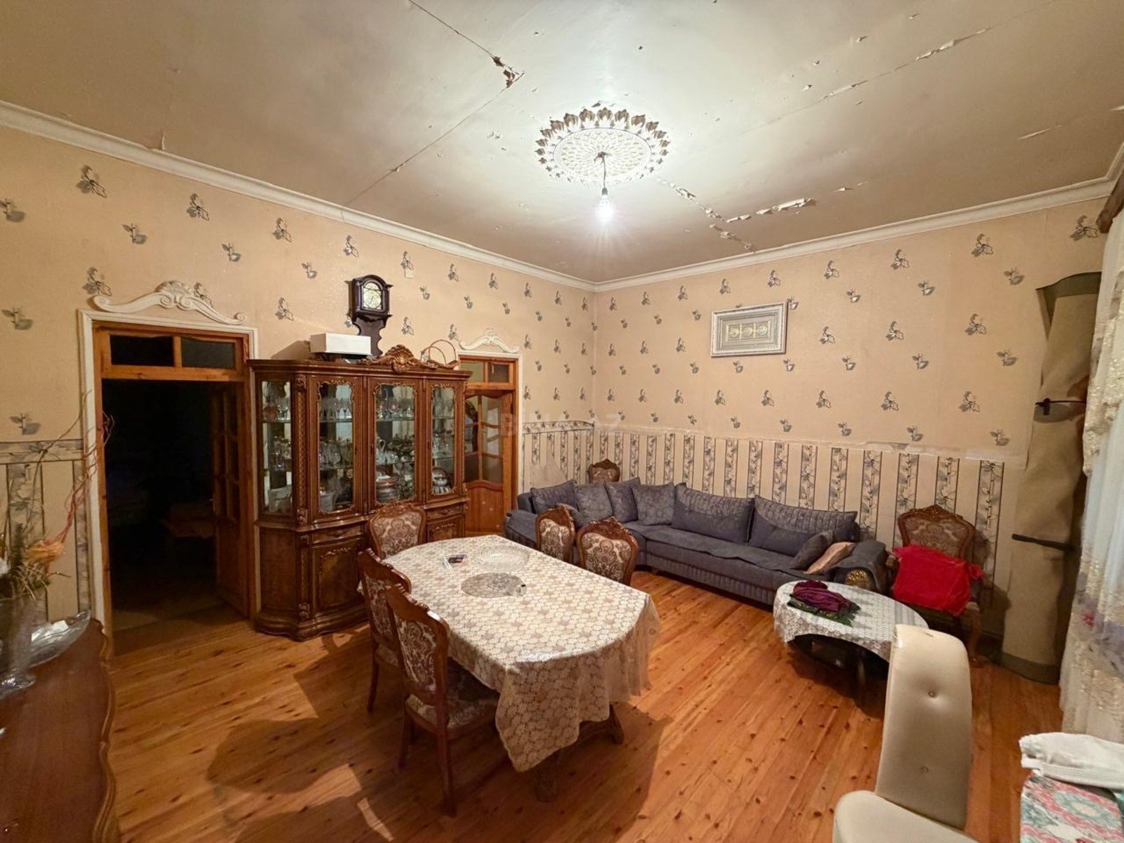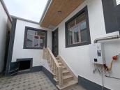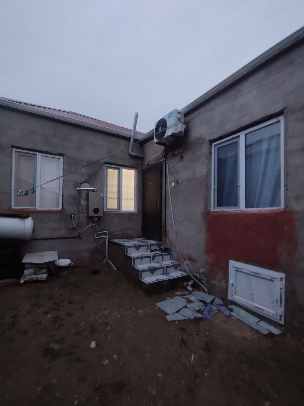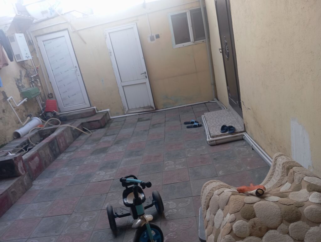 2 otaqlı həyət evi - Plan: ayrıca darvazalı kiçik həyət/bakırca, girişdə pilləkənli eyvan. Plastik giriş qapıları, pəncərələr. - Otaqlar: 1 qonaq otağı, 1 yataq otağı/kiçik otaq, mətbəx, sanitar qovşaq (eyvandan ayrıca qapı). - Mətbəx: üst və alt dolablar, qaz plitəsi və hava çəkən, paslanmayan polad evye, paltaryuyan üçün yer və qoşulma, elektrik rozetkaları. - Qonaq otağı: asma çilçıraq işıqlandırma, divar boyu pəncərə üçün jalüz pərdə, vitrİN şkafı üçün yer. Otaqda soba borusu çıxışı görünür. - Döşəmələr: yaşayış otaqlarında taxta/rənglənmiş döşəmə, dəhliz və mətbəxdə xalı/palazla örtülən sahələr. - Həyət: tam döşənmiş kafel daş örtük, su və qaz xəttləri həyət tərəfdən keçir, qaz sayğacı ...