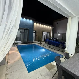 Isti Hovuzlu Bag Evlerinin Gunluk Kirayesi !! TAM TƏMİRLİ VƏ TAM ƏŞYALI MODERN tipli bağ evi kirayə verilir. 2 mərtəbəli evdə 1 geniş zal,1 mətbəx,4 yataq otağı, 2 dəhliz, 2 s/q var. 8 sot həyətdə 10x4 metr daşma tipli isti hovuz, besaetka ( maqalxana ilə), s/q və 3-4 maşınlıq parklanmağa yeri var. Həyətdə dekorativ şam ağacları var. Qaz, işıq, wi fi daimidir. Kombi və bütün otaqlarda kondisionerlər, pultla idarə olunan darvaza mövcuddur..