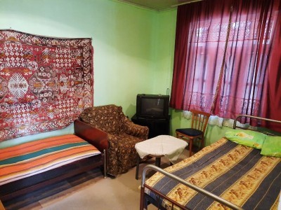 Kirayə verilir: 2 otaqlı sadə həyət evi - Plan: bir zal və bir yataq otağı, geniş sanitar qovşaq (unitaz, döşəmə drenajı). - Mebel: zalda divan və əlavə yataq/yataq dəsti; yataq otağında iki ayrı çarpayı. - Mətbəx/avadanlıq: iki kameralı soyuducu. - İstilik sistemi: radiatorlarla mərkəzi/qatı istilik (şəkillərdə radiatorlar mövcuddur). - Döşəmə və örtüklər: otaqlarda xalçalar, pəncərələrdə tül pərdə. - Elektrik və su: işıqlandırma, rozetkalar və su-kanalizasiya sistemi. - Giriş: tağlı keçidli dəhlizdən otaqlara çıxış. Ailə, tələbə və ya işçi qrupları üçün uyğun yerləşim; sadə, funksional və səliqəli planlama.