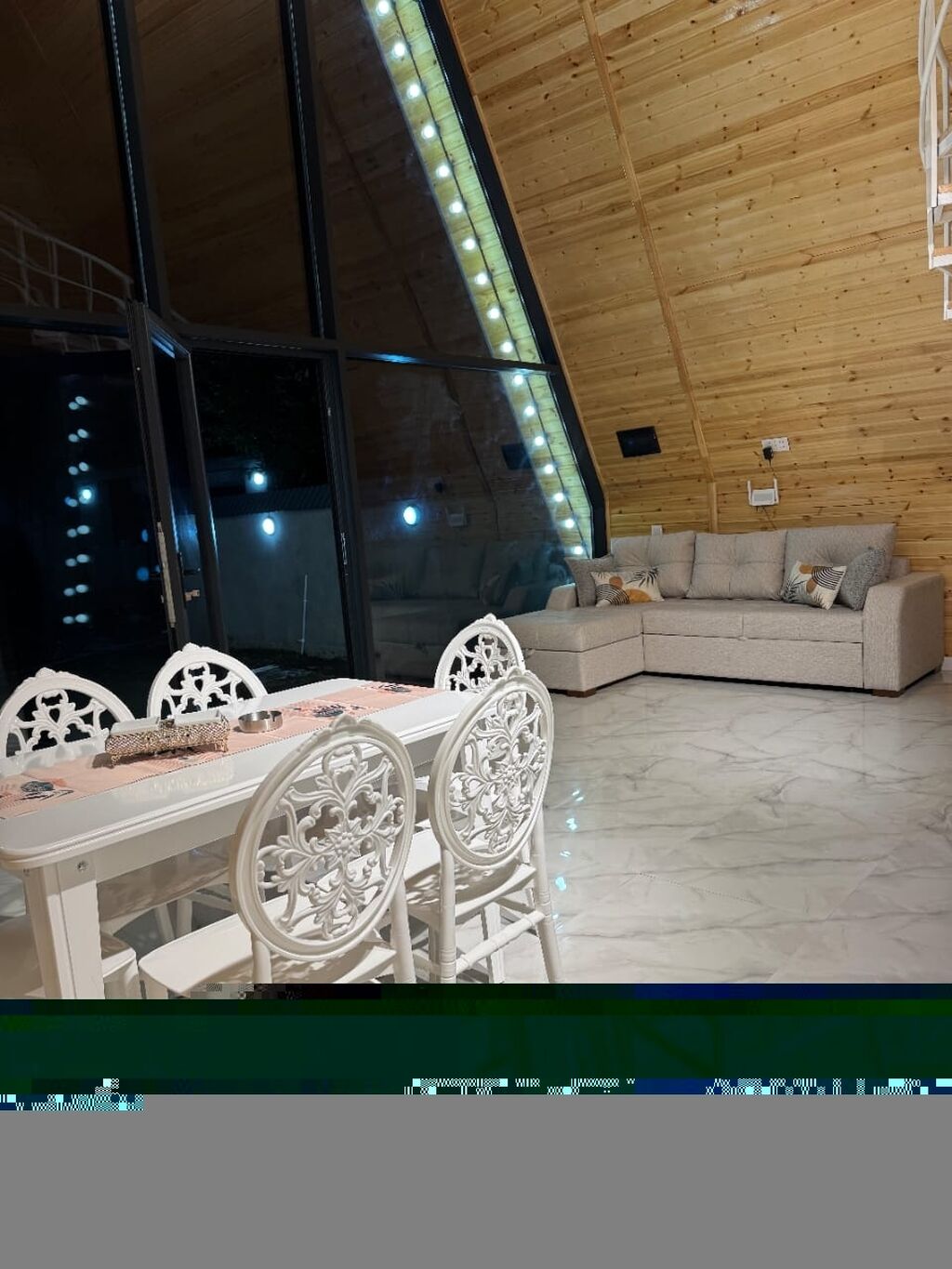 A‑Frame üslubunda istirahət evi (kottec) – geniş həyət və işıqlı fasad - Açıq şüşə ön fasad, dekorativ işıqlandırma - Həyətdə iri ölçülü üzgüçülük hovuzu, gecə işıqlandırması ilə - Yaşayış sahəsi: mərmər görünümlü kafel döşəmə, yüksək tavan, böyük panoram pəncərələr - Rahat L‑şəkilli divan, dekor yastıqlar - Ağ rəngdə yemək masası və 4 stul - Açıq mətbəx: soyuducu, qaz plitə/aspirator, çaydan/samovar, qab-qacaq rəfləri, iri iş masası - Paltaryuyan maşın - Kondisioner - Spiral pilləkənlə çıxılan yarım mərtəbə (loft) - Geniş həyət: abadlaşdırılmış cığırlar və yaşıllıq sahəsi - Şüşə qapıdan həyətə çıxış, pilləkənlərlə terasa keçid Ailəvi istirahət və dostlarla dincəlmək üçün mükəmməl məkan: m ...