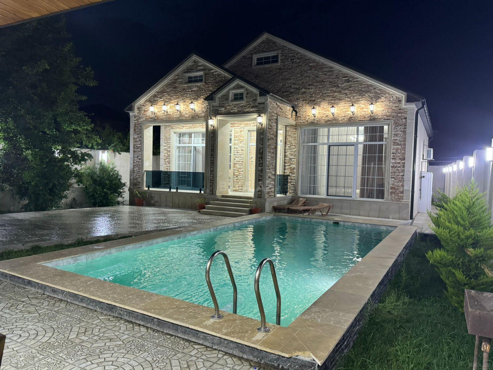 Salam her vaxtviz xeyir olsun sizlərə möhdəşəm bağ evini teqdim edirəm həyətyani sahesində , hovuz bisetka ve göz oxşayan renglrlə islənib bağ evi 6 sotdan ibarədir ✅️ magistral yola yaxındır ,4 yataq,1 zal,2 sanuzel,daxili hovuz,və s xidmətlər mövcutdur