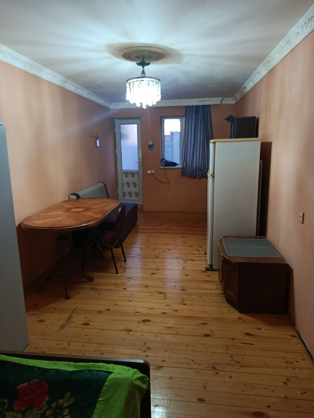 Kirayə üçün ayrıca həyət daxilində 1 otaqlı kiçik ev/studiya. - Geniş bir otaq: taxta döşəmə, tavan karnizi və işıqlı şamdan. Otaqda iki qapılı soyuducu, yemək masası və stullar, divan/çarpayi, şkaf və kiçik mebel modulları mövcuddur. - Müstəqil girişli sanitar qovşaq həyət tərəfdə: kafel-metlax döşəmə-divarlar, əl-üz yuma marketi və güzgü, işıqlandırma. - Otaqda pəncərə və həyətə çıxış qapısı, ayrıca pərdə və elektrik sayğacı görünür. - Həyət daxilində ağac və beton örtüklü sahə. Sadə və praktik yaşayış üçün uyğun, mebel və əsas məişət texnikası ilə.