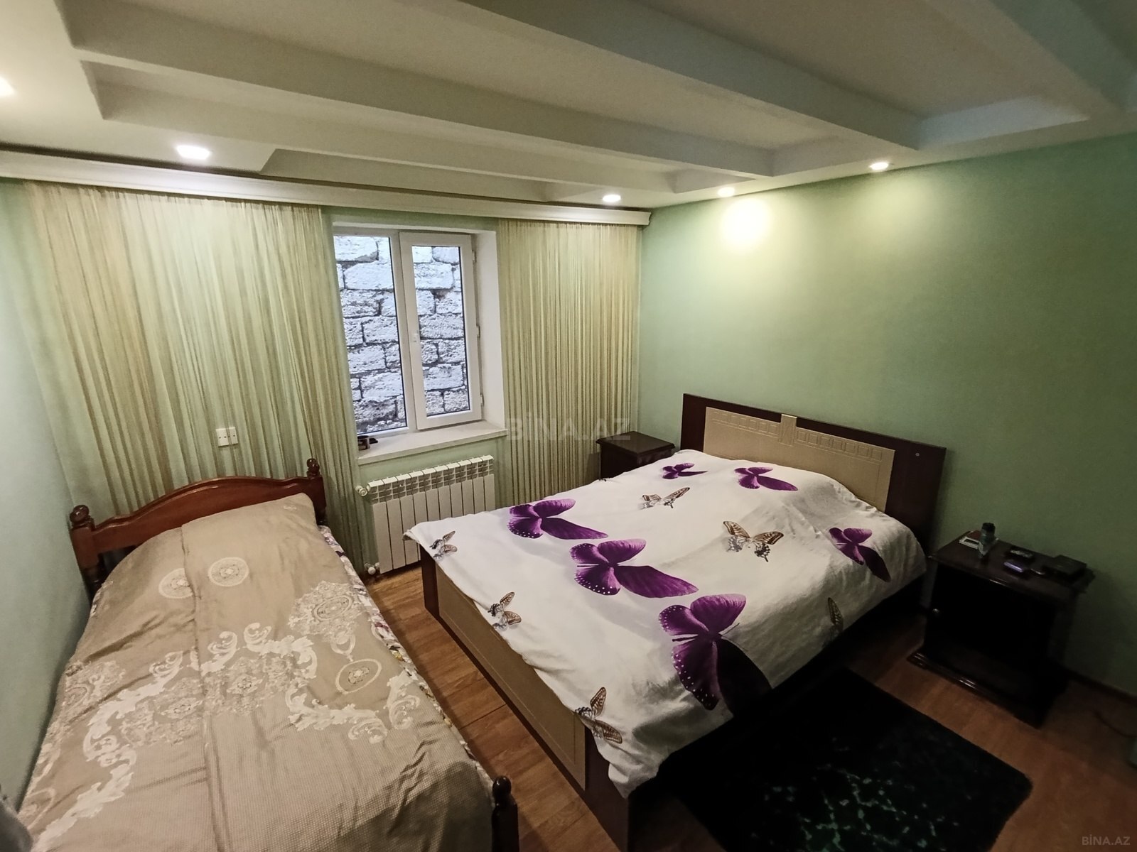 İcarəyə təqdim olunur: iki mərtəbəli evin rahat və geniş interyerə malik yaşayış sahəsi. - Plan: Taxta pilləkənli 2 mərtəbə, ayrıca yataq otaqları və geniş zal. - Mebel: Yataq otağında böyük yumşaq başlıqlı iki nəfərlik çarpayı, əlavə divan və tumbalar; zalda konsol/güzgü dəsti; mətbəx/nahar guşəsində 4 nəfərlik rattan üslublu masa-stul dəsti. - Döşəmə və divarlar: Təbii ağac elementli pilləkən və tavan hissələri, laminat döşəmə; dekorativ divar kağızları. - Pəncərələr və pərdələr: Geniş pəncərə, qalın və tül pərdələr; digər otaqda jalüz pərdələr. - Qapılar: Şüşə əlavəli taxta daxili qapılar. - İsitmə: Radiator sistemi görünür. - Digər: Yumşaq xalçalar, işıqlandırma, güzgü və saxlama bölməl ...
