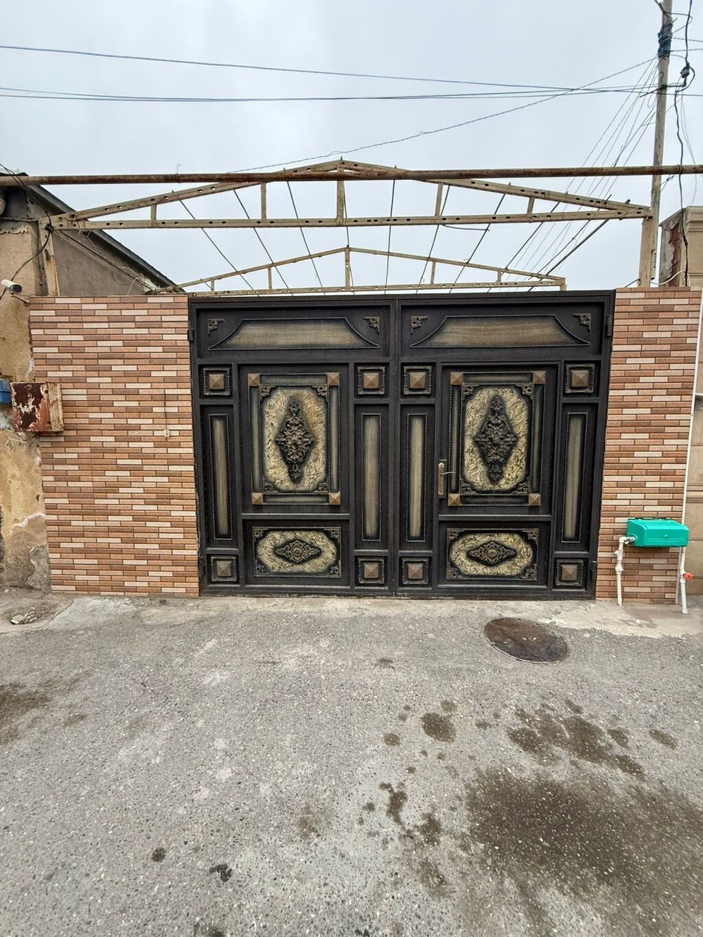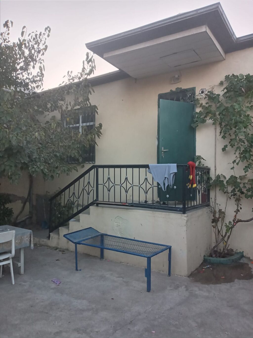 1 otaqlı həyət evi - Planlaşdırma: girişli kiçik həyət/balaca eyvan, 1 otaq, mətbəx, sanitar qovşağı. - Mətbəx: divar boyu dolablar, qaz plitəsi (4 göz), çıxarıcı hava sistemi, qab-qaşıq rəfi, qranit tipli iş masası. Mətbəxdən həyətə çıxış mövcuddur. - İsitmə/suya nəzarət: qaz su qızdırcısı (kombi tipli su qızdırıcısı görünür). - Soyutma/İstilik: split kondisioner (VESTA). - Pəncərələrdə dəmir barmaqlıqlar. - Döşəmə: otaqlarda taxta döşəmə, həyət və girişdə kafel/daş örtük. - Tavan: gipskarton karnizli, işıqlandırma ilə. - Giriş qapısı: metal, dekorativ naxışlı; pilləkənlərlə yuxarı qaldırılmış giriş. - Kommunikasiya girişləri: qaz, su və elektrik xətləri çəkilib. Məkan kiçik ailə və ya tə ...