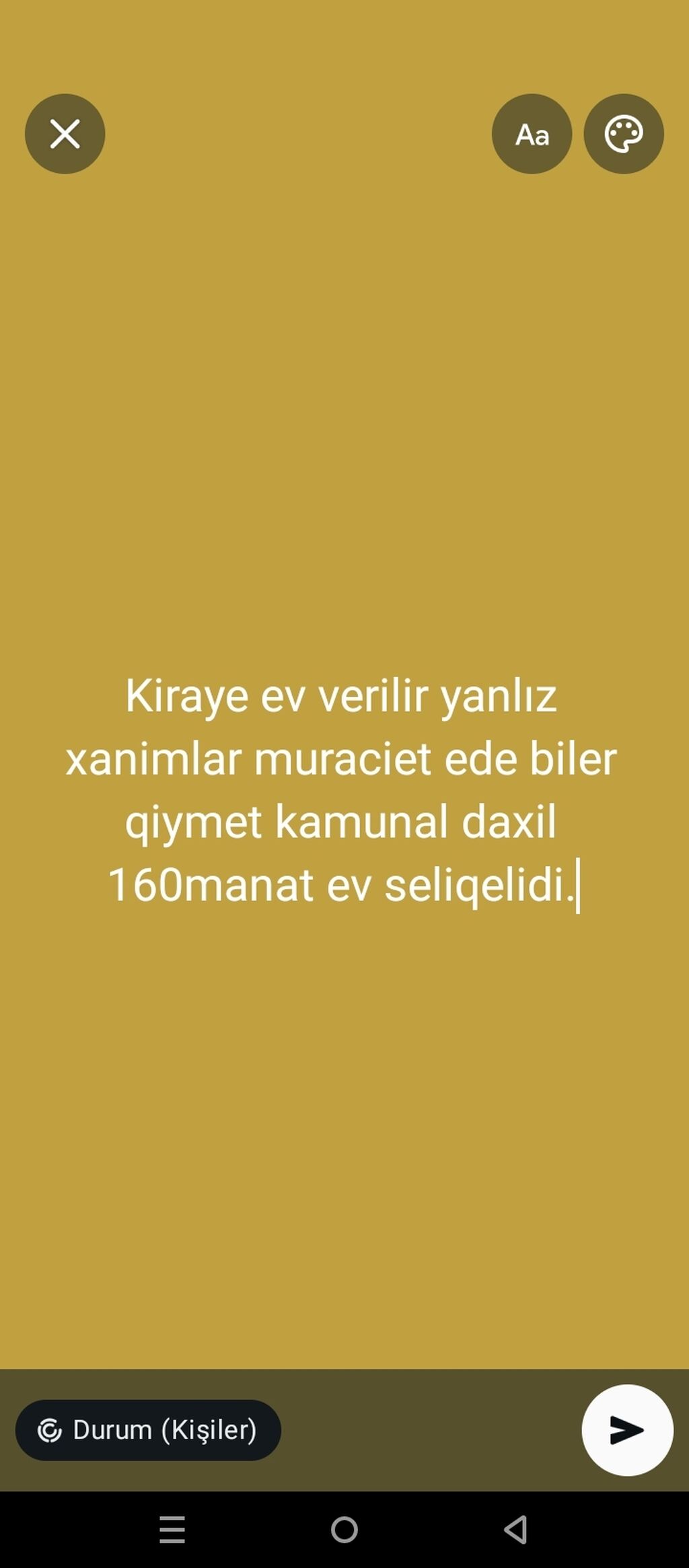 Kirayə ev təklif olunur. Yalnız xanımlar müraciət edə bilər. Qiymət: 160 manat – kommunal xərclər daxil. Ev səliqəlidir.yerlesir montinde şerab zavodu terfde