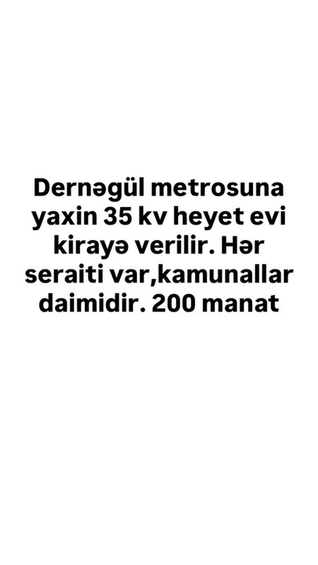 Dernegül metrosuna yaxın 35 kv.m həyət evi kirayə verilir. Evdə hər şərait mövcuddur, kommunallar daimi. Qiymət: 200 manat. Elavə 1 otaqli her seraiti olan evde var eyni erazide maraqlananlar yazsin 0777610793