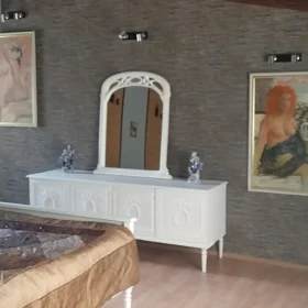 Həyətyanı ev – mebelli - Tək mərtəbəli ev, qırmızı kirəmit dam örtüyü - Geniş həyət və ya bağ sahəsi, dekorativ və meyvə ağacları - Həyətdə taxta it/fərdi kiçik daxma - Daxili plan: yataq otağı, zal, mətbəx zonası, sanitar qovşaq - Sanitar qovşaq: kafel-metlax, duş sistemi, unitaz, qazla işləyən su qızdırıcısı (kolonka) - Yataq otağı: çarpayı, tumbalar, güzgülü tualet masası - Zal/yataq: iri sürgülü şkaf, pəncərələr pərdələrlə - Tavan taxta üzləməli, işıqlandırma mərkəzi lampa ilə - İsitmə üçün radiatorlar görünür - Pəncərələr həyətə baxır, təbii işıq yaxşıdır Notlar: - Şəkillərdə göstərilən mebel və avadanlıqlar mövcuddur. - Tarix göstəricisi: 28 Avqust, 2024 (şəkil məlumatında).