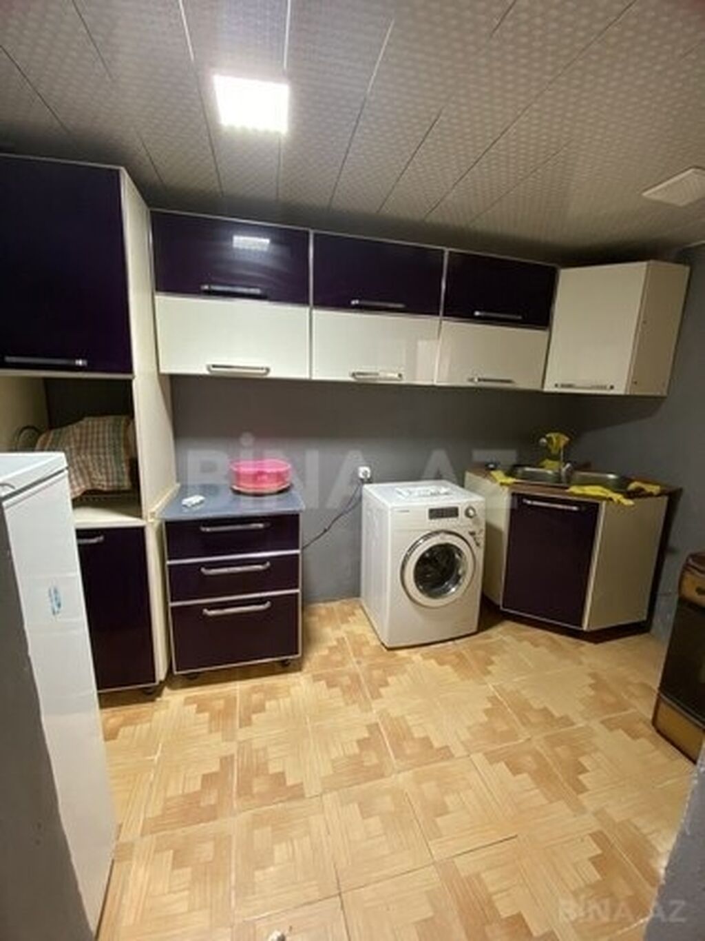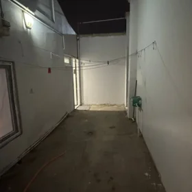 12otaqlı həyət evi - Plan: dəhlizdən girişli, bir yataq otağı, açıq mətbəxli geniş zal/studiya tipli otaq, ayrıca kiçik otaq/iş otağı. - Həyət: beton örtüklü dar keçidli həyət hissəsi, divarlarla əhatələnib. - Döşəmə: otaqlarda laminat. - Tavan: ağ rəngdə rəxli (plastik panelli) tavan, spot/led lampa yerləri. - Mətbəx: divar dolabları və iş səthi, qaz plitəsi üçün yer, aspirator borusu çıxışı, kiçik soyuducu və paltaryuyan. - İstilik: qaz sobası/peç üçün baca çıxışı. - Sanitar-kommunikasiya xətləri: həyət boyunca açıq çəkilmiş borular görünür; elektrik işığı quraşdırılıb. - Yataq otağı: iki nəfərlik çarpayı, iri qarderob şkafı. - Zal: divan mövcuddur. - Pəncərələr: plastik çərçivələr. Komp ...