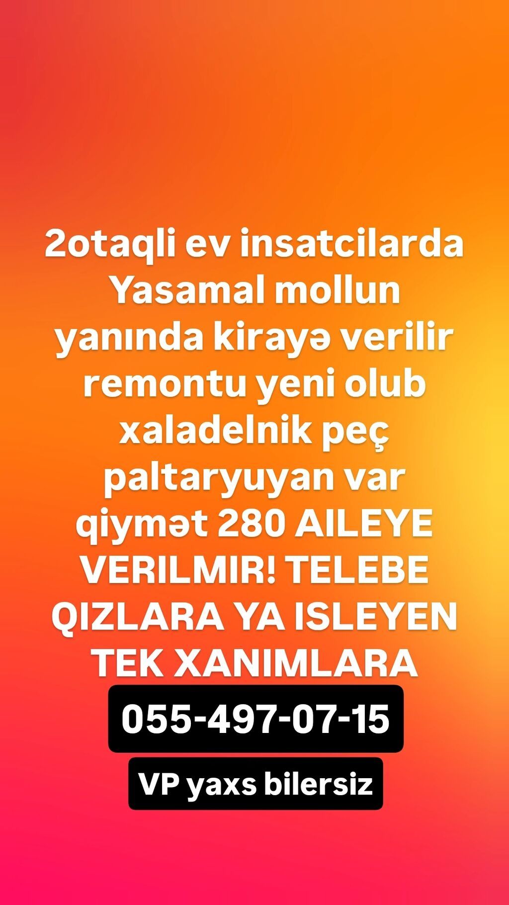 Bakıxanov qəsəbəsi dağ tərəfdə həyət evləri olan hissədə 2 mərtəbəli 3-cü mərtəbə mansarlı təmirli əşyalı ideal mənzil kirayə verilir. Yalnız ailəyə verilir. Xidmət haqqı 30% dir.