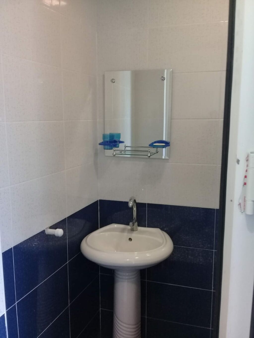 - Sanitar qovşaq: keramik kafel, ayaqüstü rakovina, güzgü və aksesuar rəfləri.