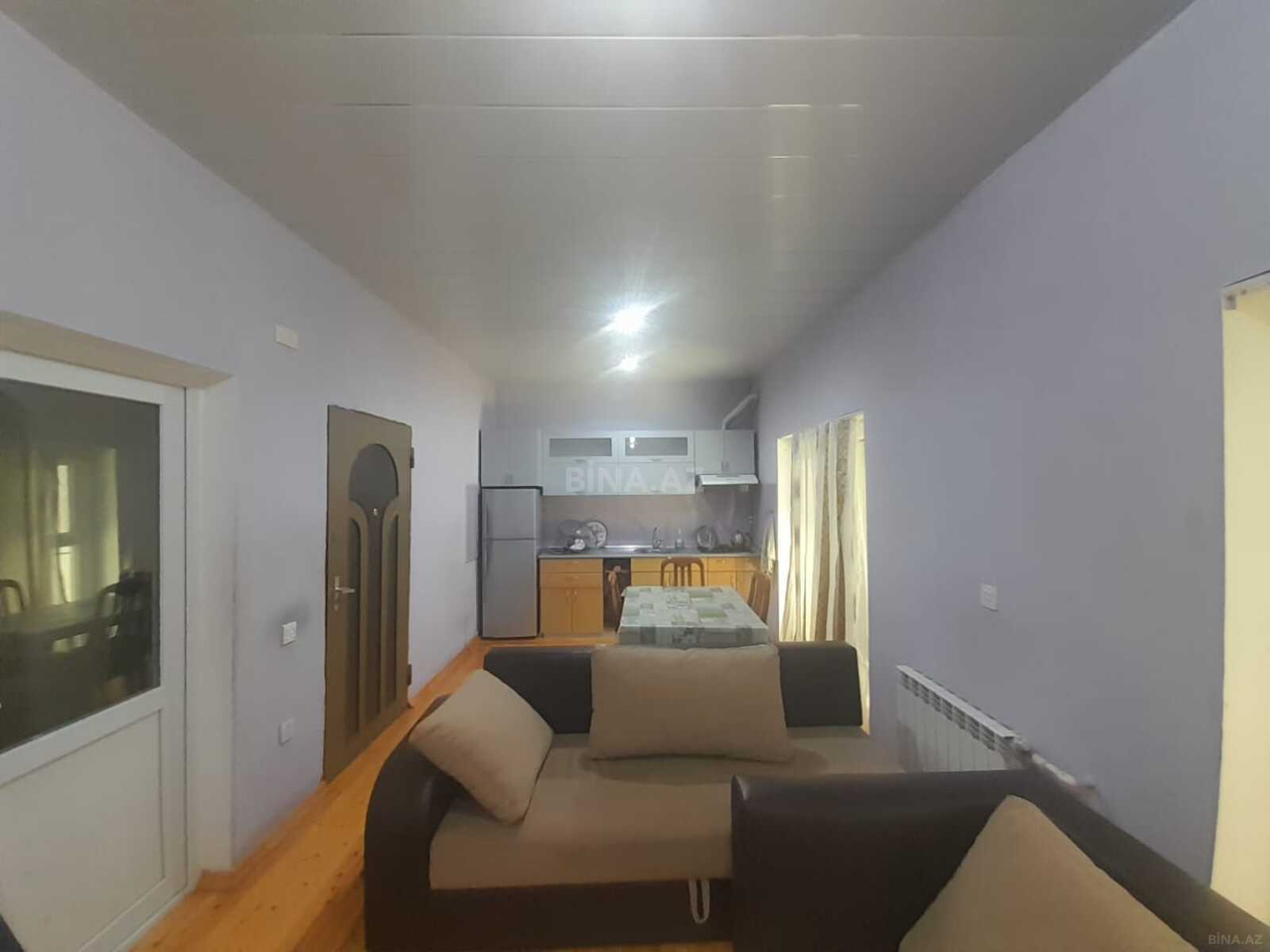 Kirayə verilən 2 otaqlı həyət evi - Plan: girişdə xol, açıq tağ keçidli zal, ayrıca yataq otağı - Mətbəx zonası: qaz plitəsi olan kiçik mətbəx guşəsi - Məişət: radiatorlu istilik sistemi, plastik pəncərə - Döşəmə: taxta, üzərində xalçalar - Mebel: divan kreslo, yataq dəsti, komod və güzgü, masa və iki oturacaq - Pəncərələrdən işıqlı otaqlar, hündür tavanlı - Daxili qapı: taxta, giriş qapısı dekorativ şüşəli - Pərdə və jalüzlər quraşdırılıb Ailə üçün uyğun, səliqəli planlaşdırma və əsas mebellərlə təchiz olunub.