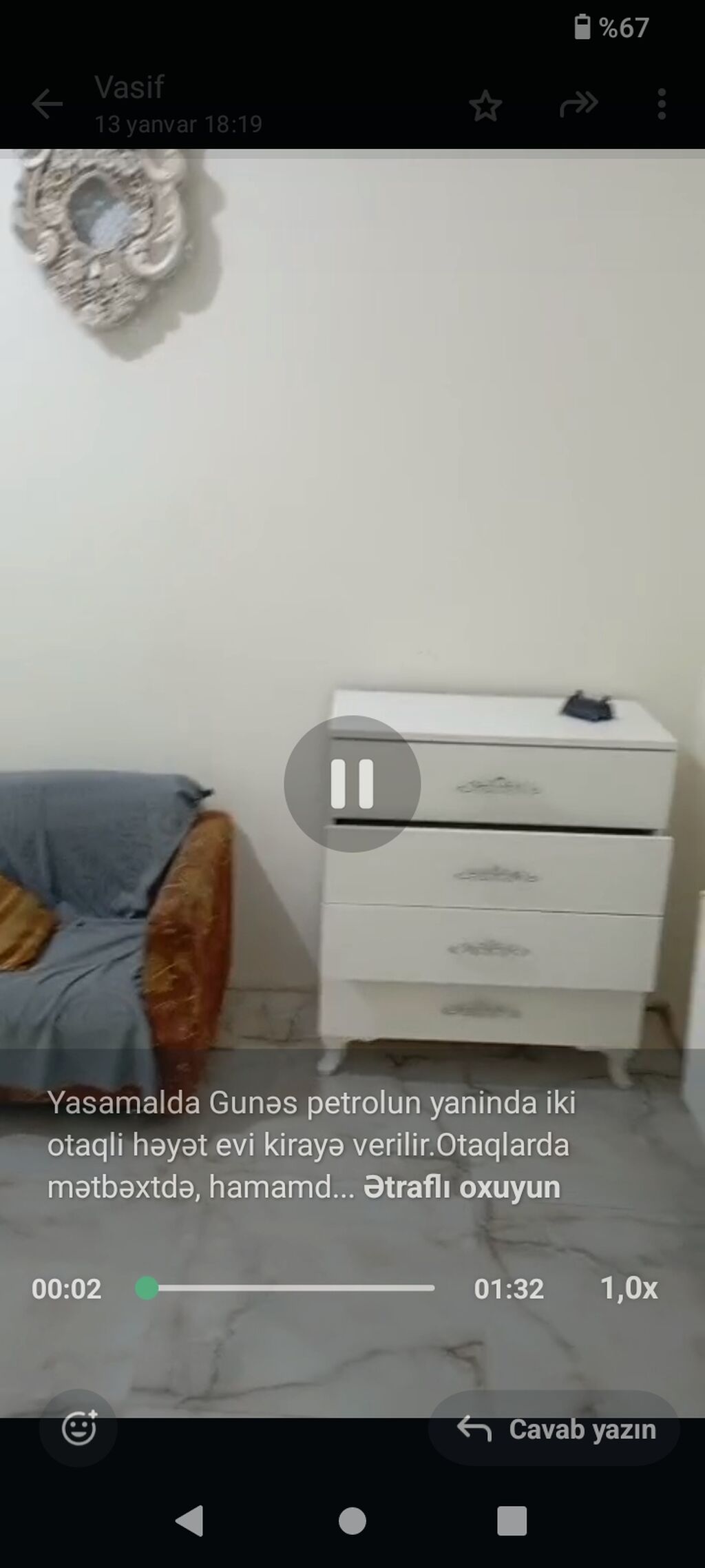 Yasamalda Günəş petrolunun yanında yerləşən 2 otaqlı həyət evi kirayə təqdim olunur. Şəkillərdə görüldüyü kimi: - Mətbəx: qaz plitəsi, paltaryuyan maşın, işıqlı və səliqəli iş sahəsi. - Hamam/tualet: kafel-metlax, lavabo, güzgü rəfi, duş sistemi və döşəmə trapı. - Otaqlar: yumşaq mebel, komod və divar dekoru. - İnfrastruktur: girişdə quraşdırılmış internet yönləndiricisi (Wi‑Fi üçün avadanlıq). - Döşəmə və divarlar təmiz, işıqlı interyer. - Pəncərəli, havalandırması yaxşı məkan. Mətn alt yazısında qeyd: “Yasamalda Günəş petrolun yanında iki otaqlı həyət evi kirayə verilir. Otaqlarda, mətbəxdə, hamamd...”