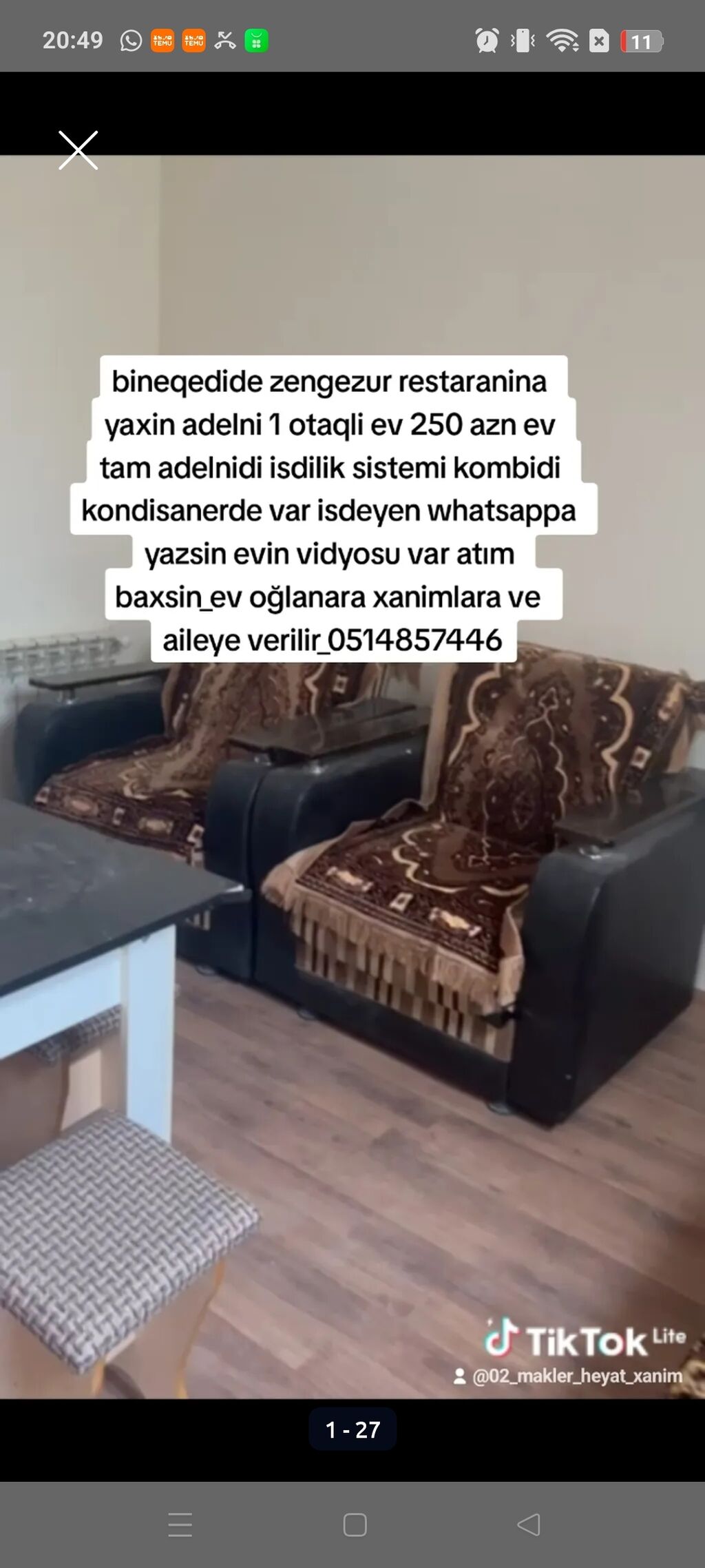 Bineqedide zengezur restaranina yaxin adelni 1 otaqli ev 250 azn mûşderi ferqi yoxdu evin vidyosu var isdeyen yazsin atım baxsin _0514857445