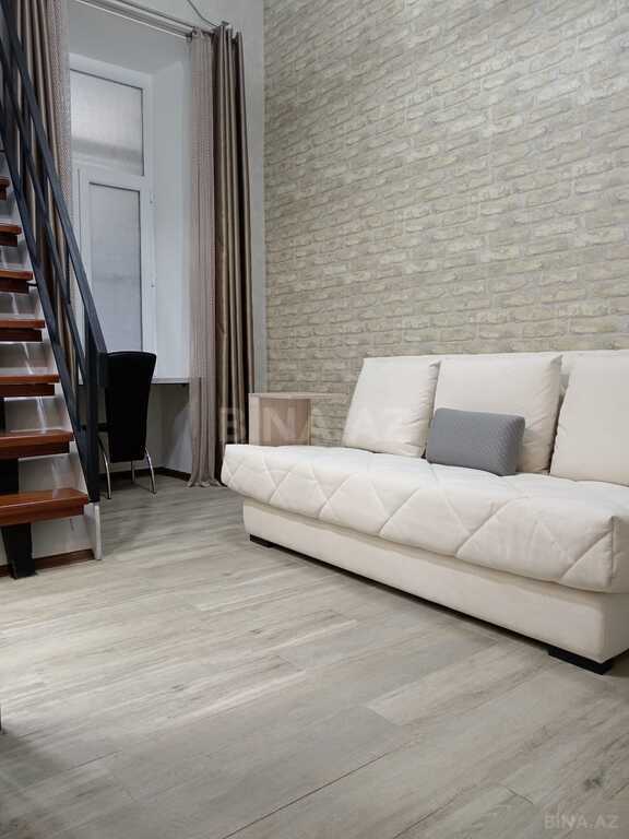 Kirayə üçün studiya tipli mənzil. - Açıq mətbəxli geniş otaq: qaz plitəsi, aspirator, üst-alt dolablar, iş masası. - Soyuducu, divan, yemək masası və 2 taburet. - Döşəmə: laminat; tavanlarda badamça-kartonpiyer. - Divarlarda dekorativ daşlı mətbəx paneli. - Girişdən koridor, böyük şkaf-garderob güzgülü qapılarla. - İşıqlı otaq, pəncərə və eyvana çıxışlı qapı; pərdələr quraşdırılıb. - Mərkəzi radiator istilik sistemi. - Bir neçə xalça, ayaqyolu-çəkməlik üçün kiçik rəf koridorda görünür. - Elektrik işıqları hazır vəziyyətdə, rozetkalar yan divarlarda. Minimalist mebellə tam yaşayışa hazır.