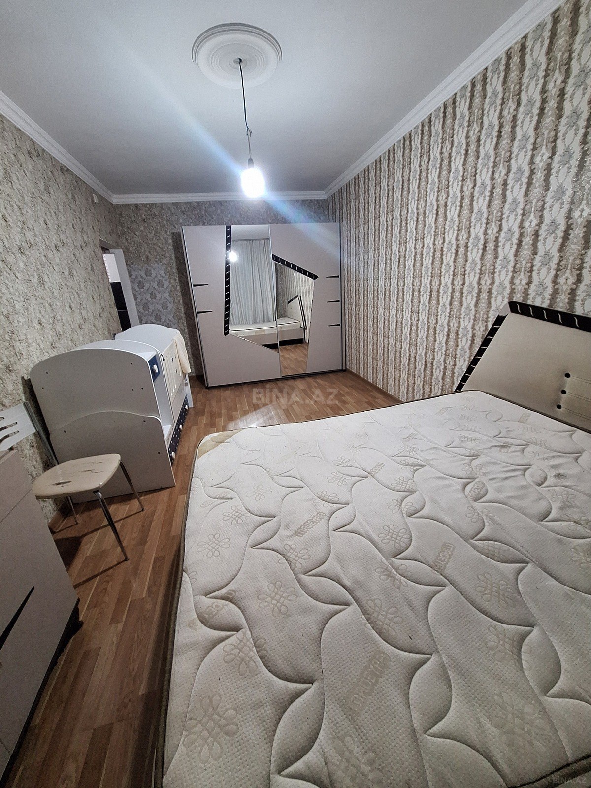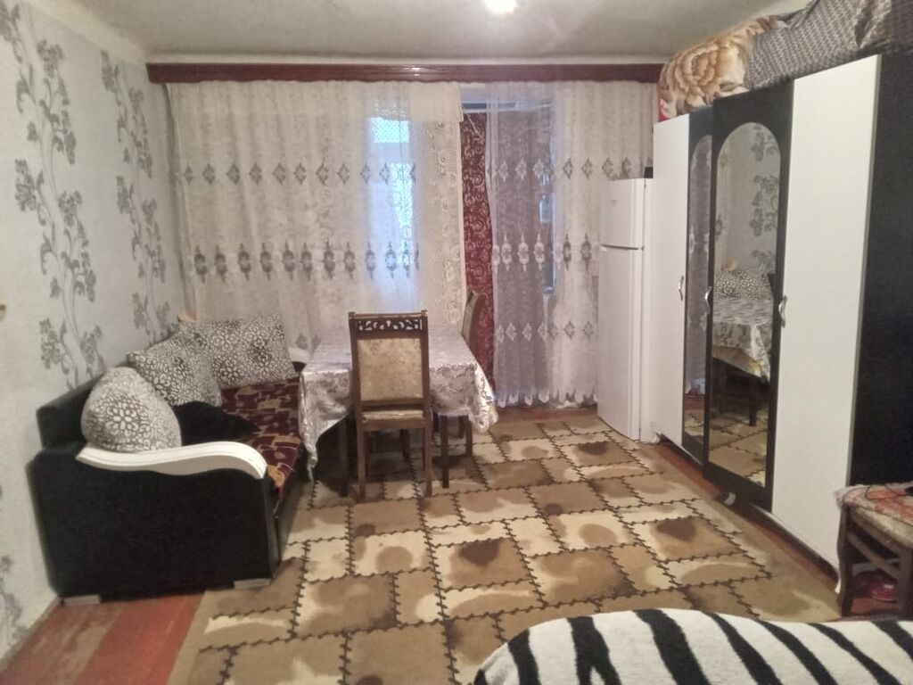Kirayə üçün tam mebelli, rahat bir otaqlı mənzil. Xüsusiyyətlər: - Geniş, işıqlı otaq: divar kağızlı, pərdə və tül ilə. - Yataq zonası: böyük ikinəfərlik çarpayı, çarpayıüstü örtü. - Qonaq zonası: künc divanı, bir neçə dekorativ yastıq. - Yemək zonası: süfrəli masa və stullar. - Saxlama: böyük 3 qapılı şkaf (güzgülü), komod və güzgülü tualet masası. - Mətbəx/soyuducu: otaqda iki qapılı soyuducu. - Elektronika: divara quraşdırılmış televizor. - Döşəmə: xalçalarla örtülü taxta döşəmə. - Pəncərə və balkon çıxışı görünür, pərdə və storlarla təmin olunub. Uyğunluq: - Tək şəxs, cütlük və ya tələbə üçün praktik planlama. - Otaqda həm istirahət, həm də yemək/iş sahəsi mövcuddur. Əlavə: - Asılqan, ...