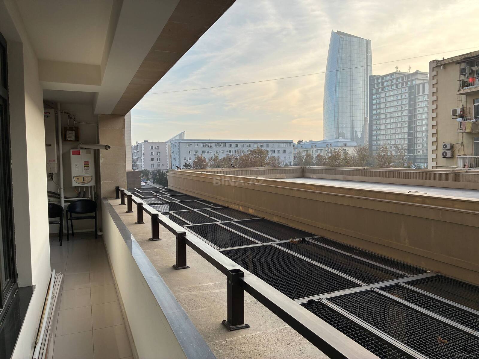 - Balkon: şəhər panoraması, metal məhəccər, kafel/laminat tipli döşəmə örtüyü, kondisioner blokunun yerləşdirilməsi üçün sahə.