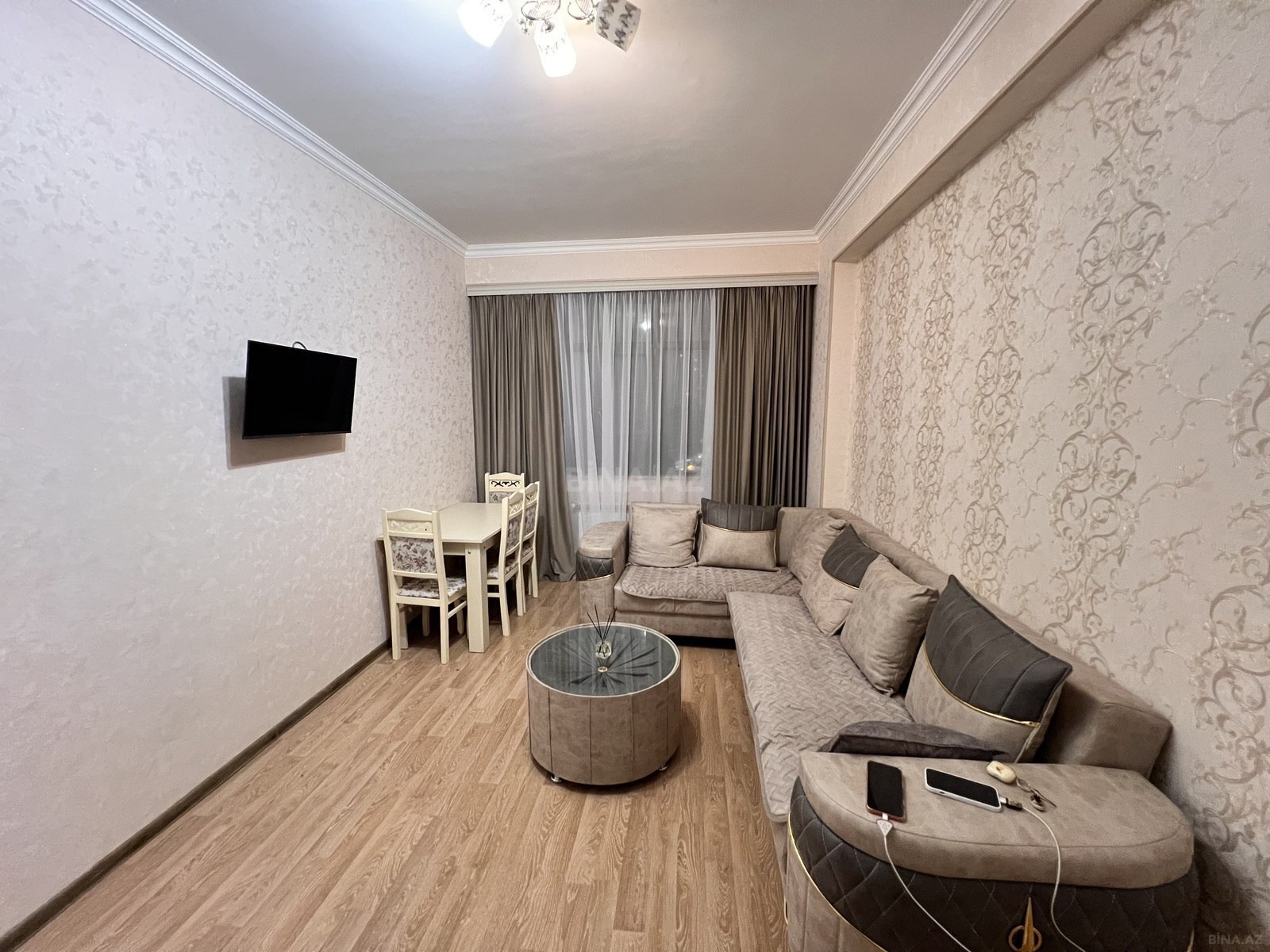 - Mebel: qonaq otağında künc divan, şüşə üstlü yemək masası və 4 stul; yataq otağında iki çarpayı, iri güzgülü tualet masası, taburet, divar TV üçün bərkitmə; həcimli qarderob şkafları