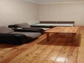 - Geniş otaq: iki nəfərlik taxta çarpayı, yumşaq künc divan və əlavə divanlar, pərdə və xalılar.