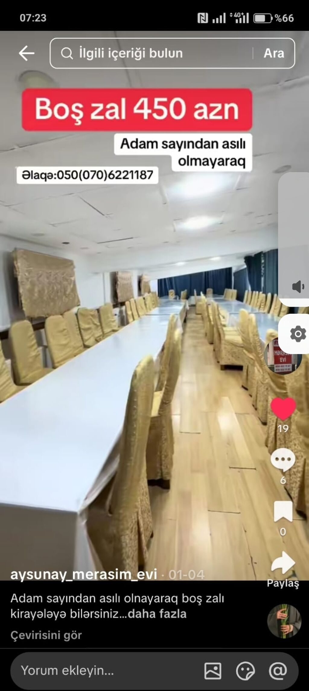 Boş mərasim zalı – 450 AZn Adam sayından asılı olmayaraq verilən geniş və işıqlı tədbir zalı. Uzun banket masaları, rahat stullar, parça örtüklər və dekor pərdələr ilə təşkil olunub. İşıqlandırma tavan spotları ilə bərabər, zal boyunca sütunlu planlama var. Döşəmə laminat, masalar süfrə ilə təqdim olunur. , Zalda geniş keçidli masa düzülüşləri mümkündür. Qiymət: 450 AZN (adam sayından asılı deyil)
