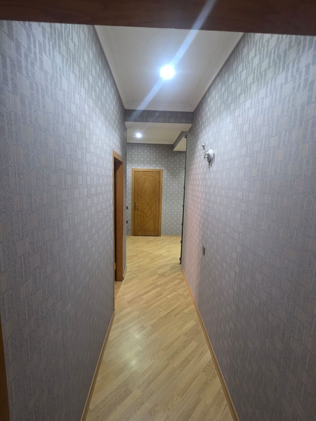 - Döşəmələr: otaqda laminat tipli parlaq örtük, mətbəx və sanitar qovşaqda kafel.