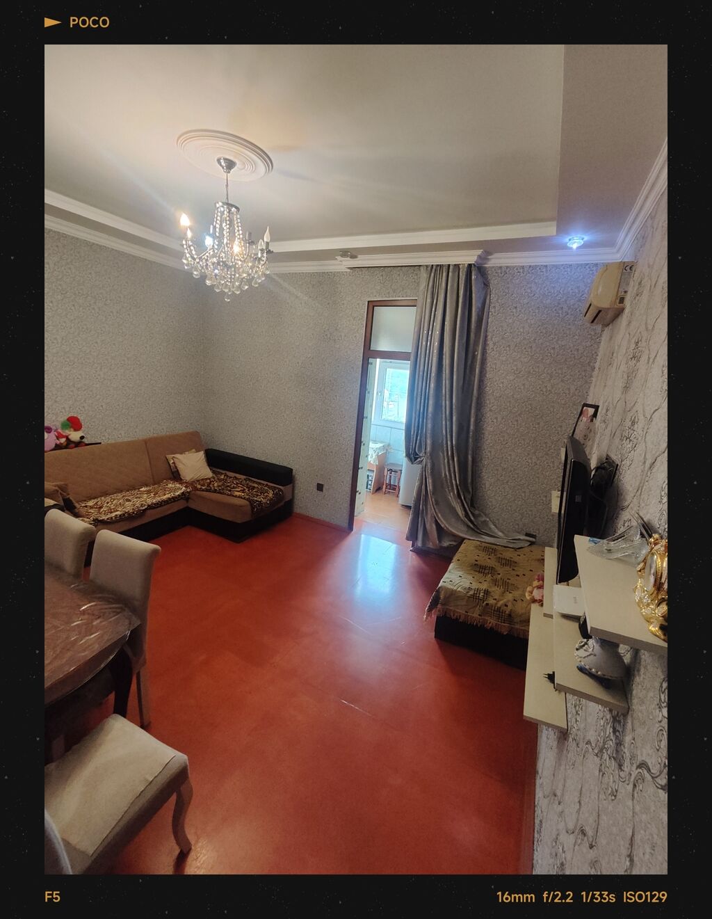 - Zal: asma tavan, bəzəkli çilçıraq, kondisioner, divar kağızı, TV üçün divar rəfləri. Otaqdan mətbəxə keçid.