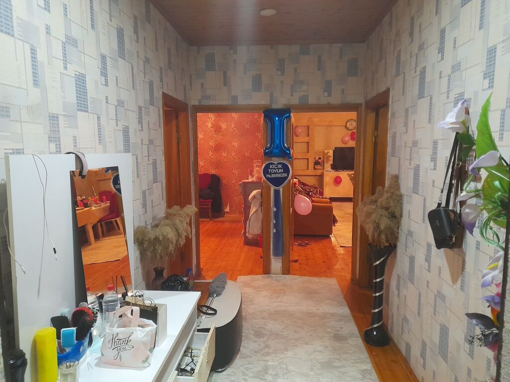 - Divarlar: qismən kağızlı və aşıqlanmış səthlər, yenilənməyə hazır baza.