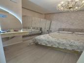 - Yataq otağı: pastel tonlarda divarlar, pəncərəli və işıqlı məkan, karniz və qatı pərdələr, çilçıraq. Yumşaq başlıqlı iki nəfərlik çarpayı, kompakt şkaf-komod.