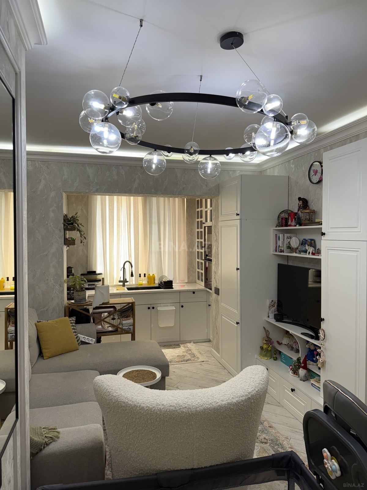 2 otağa düzəldilmiş studio tipli mənzil 28 May metrosunun ikinci çıxışında, 28 MALL Ticarət Mərkəzindən 2 dəqiqəlik məsafədə yerləşir. Modern üslubda yüksək keyfiyyətli tikinti materialları ilə təmir olunmuş bu mənzil minimalizm dizayn ilə tamamlanıb. Mənzilin 1 eyvanı və 1 sanitar qovşağı var. Eyvan yataq otağının qarşısındadır və əlavə əşyalar üçün dolab ilə təmin olunub. Mənzil həmçinin məişət texnikası (paltaryuyan, qabyuyan, soyuducu, 2 ədəd kondisioner, soba, kombi, 2 ədəd televizor) ilə təmin olunub və tam əşyalı şəkildə satışa çıxarılıb. Sanitar qovşağı brend hamam aksesuarları ilə təchiz edilib.