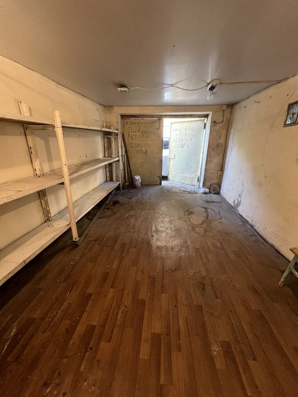 Qeyri-yaşayış təyinatlı qapalı qaraj/anmabar sahəsi. Xüsusiyyətlər: - Sahə: 16.5 m² (sənəddə göstərilib) - Həcmi: 50 m³ - Tikinti altı sahə: 21 m² - Mərtəbə: 1 - İkiyarpaq metal giriş qapısı, asma qıfıl üçün yer - Elektrik təchizatı var (şit qutusu görünür) - Daxili hündürlük: təqribən 2.05 m, xarici hündürlük: 2.35 m (sənəddə) - Beton bünövrə, m/dəmir xarici divarlar - Daxildə uzun rəf sistemi - Taxta döşəmə örtüyü - Darvazaya yaxın yerləşən pəncərə/qapı ilə işıqlanma Uyğundur: - Avtomobil üçün qaraj - Kiçik anbar və ya təsərrüfat sahəsi - Alət, ehtiyat hissələri və materialların saxlanması Sənəd şəkillərində bütün göstəricilər açıqlanıb.