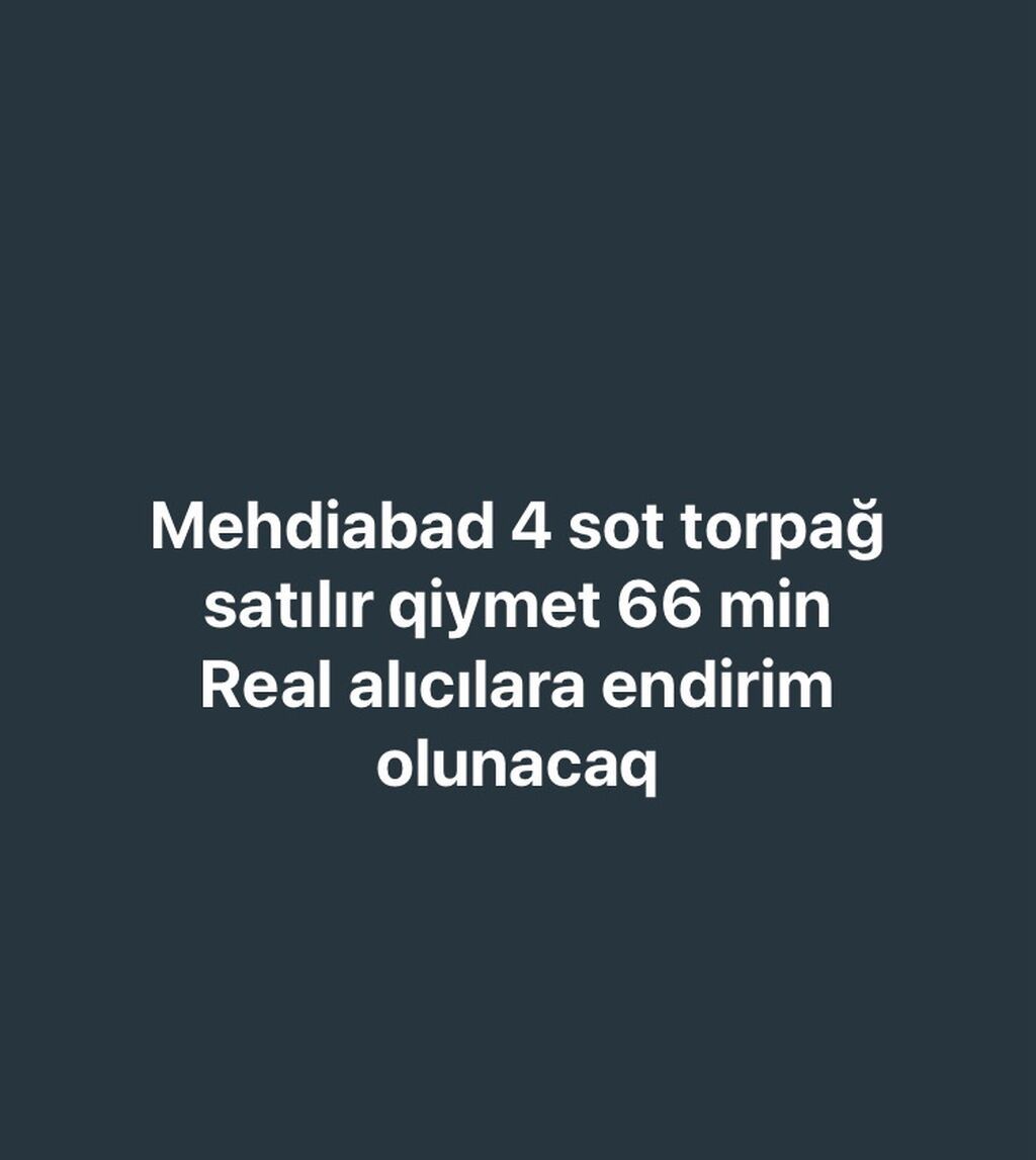 Mehdiabadda 4 sot torpaq sahəsi satılır. Qeyd olunan qiymət: 66 000. Real alıcılara endirim ediləcək.