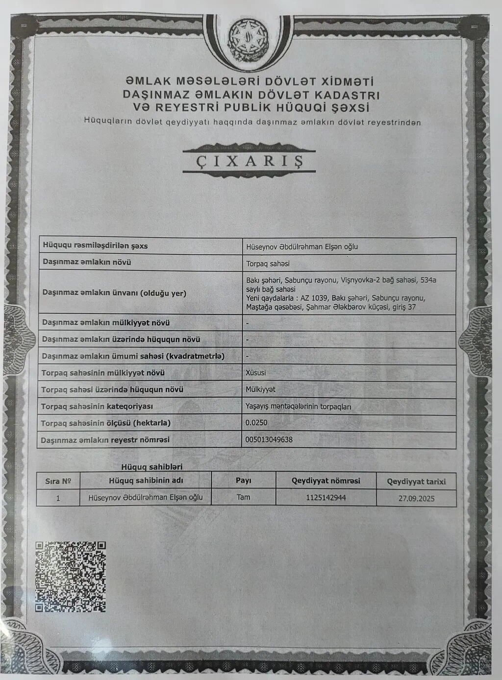 Yaşayış sahəsinin torpagı . Kupcalı . Hündür ərazidə yerləşir . Dənizə ponorama . Yol asvalt .Bütün komunallar var . Torpaq hisselerede bölünüb satılır . 25 >50 .