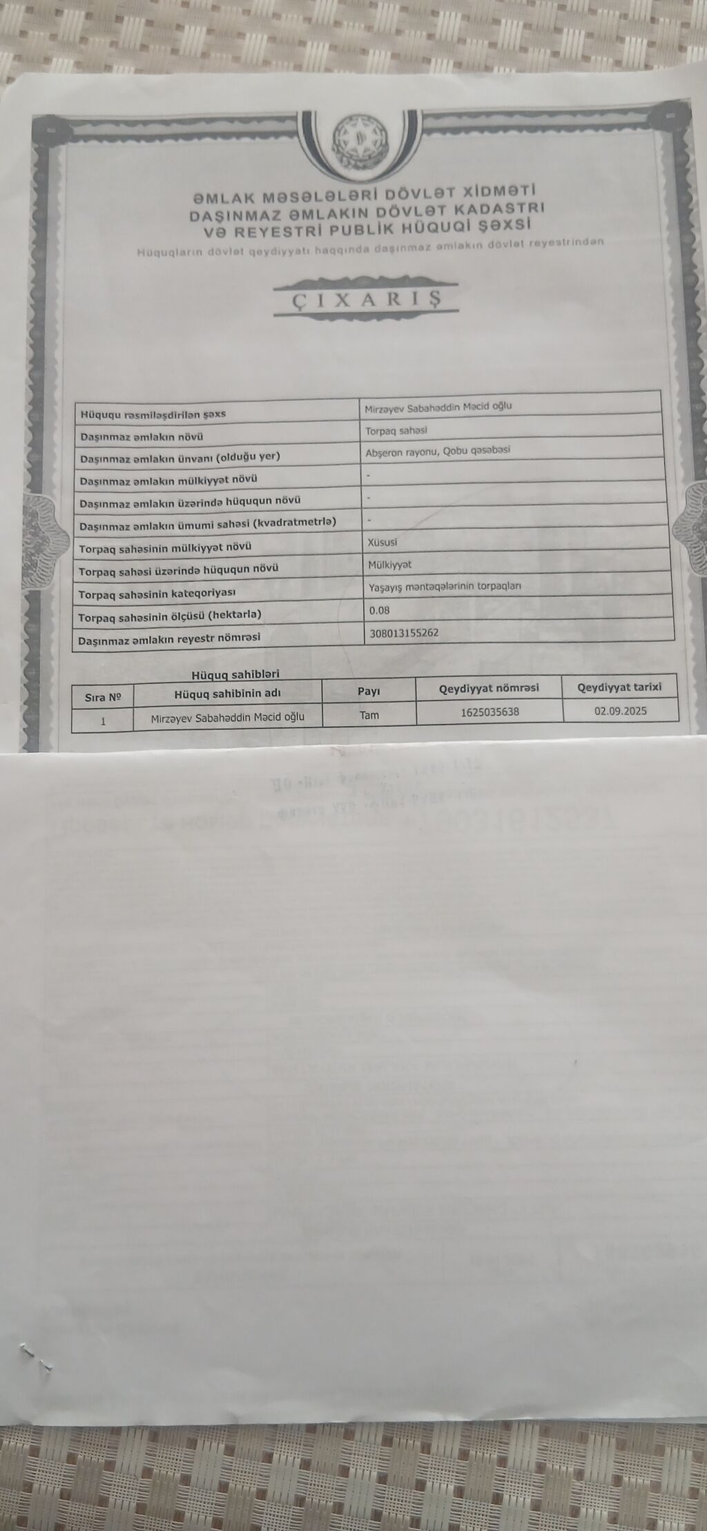 Təcili olduğu üçün dəyərindən aşağı satılır. Torpaq xüsusi mülkiyətdir, özümündür. Zığda dəniz görüntülü, gözəl Panaramalı fərdi yaşayış üçün nəzərdə tutulmuş torpaq sahəsin də yerləşir. Kupça ( Çıxarış ) var. Torpaq şəkildə göründüyü kimi kvadratdır, hasarlıdır, darvaza qapısı var, ətraf təmiz yaşayış yerləridir. Ev tikib yaşamaq üçün əlverişli və gözəl yerdir.